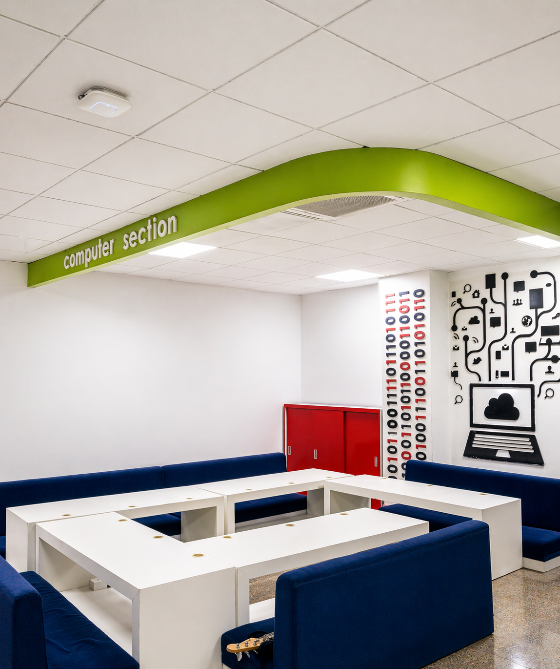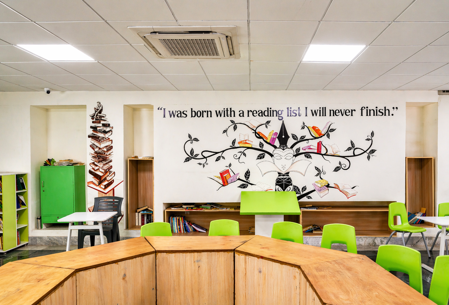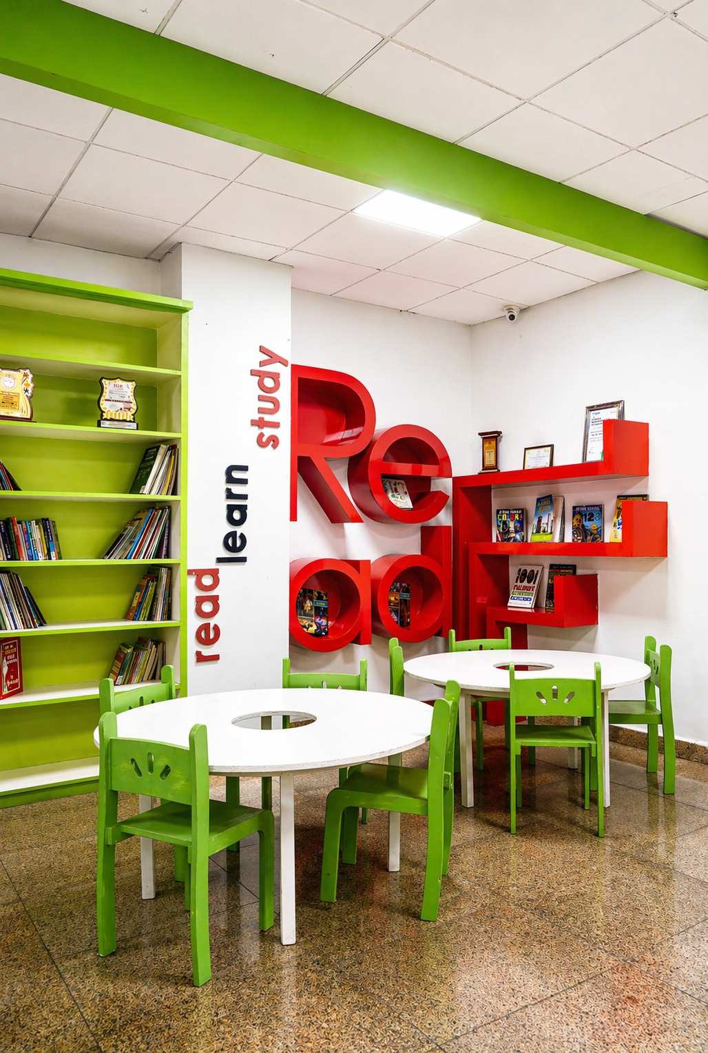 CMS, Gomti Nagar Extension presents an educational architecture that combines institutional dignity with a child-friendly learning environment. The exterior composition uses exposed brick panels, white plastered surfaces, rounded corner elements and a formal central entrance with columns to create a balanced and recognizable façade. Inside, the design becomes more playful and interactive, with bright color accents, themed learning zones, open reading corners, custom shelving and graphic wall art that support creativity and engagement. The interiors are planned to feel welcoming, flexible and age-appropriate, while still remaining orderly and functional. Overall, the building reflects a thoughtful blend of discipline, warmth and contemporary educational design.