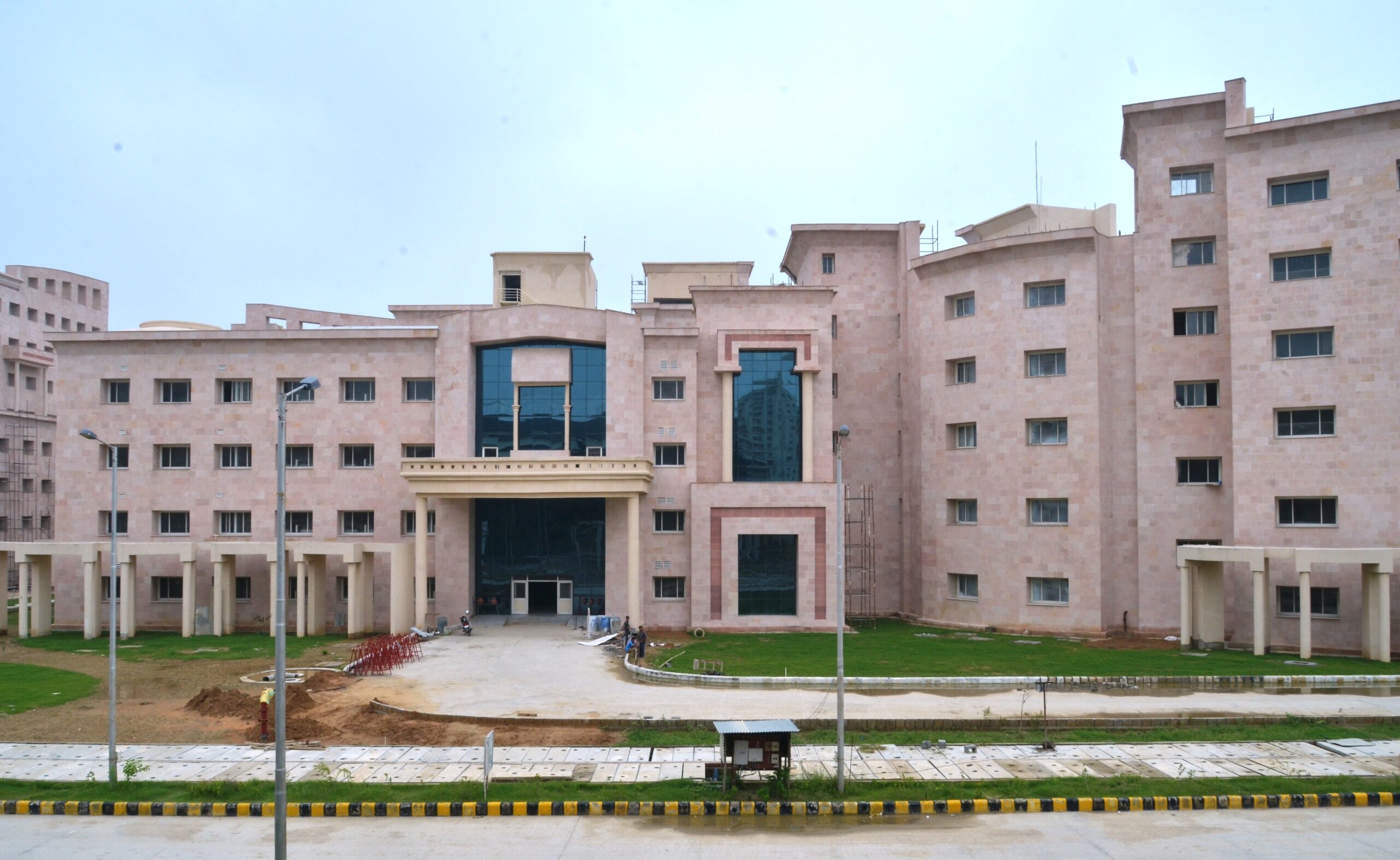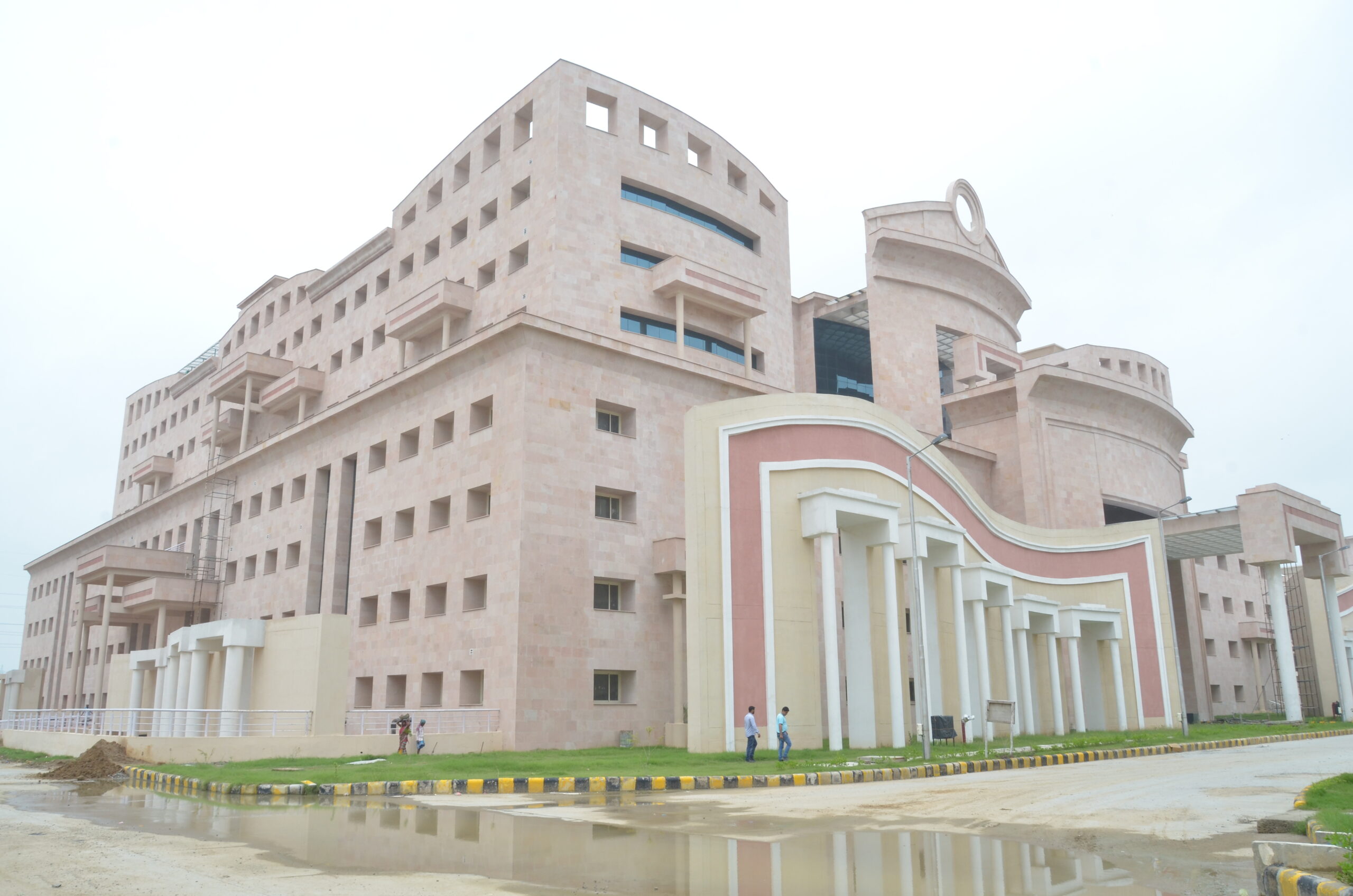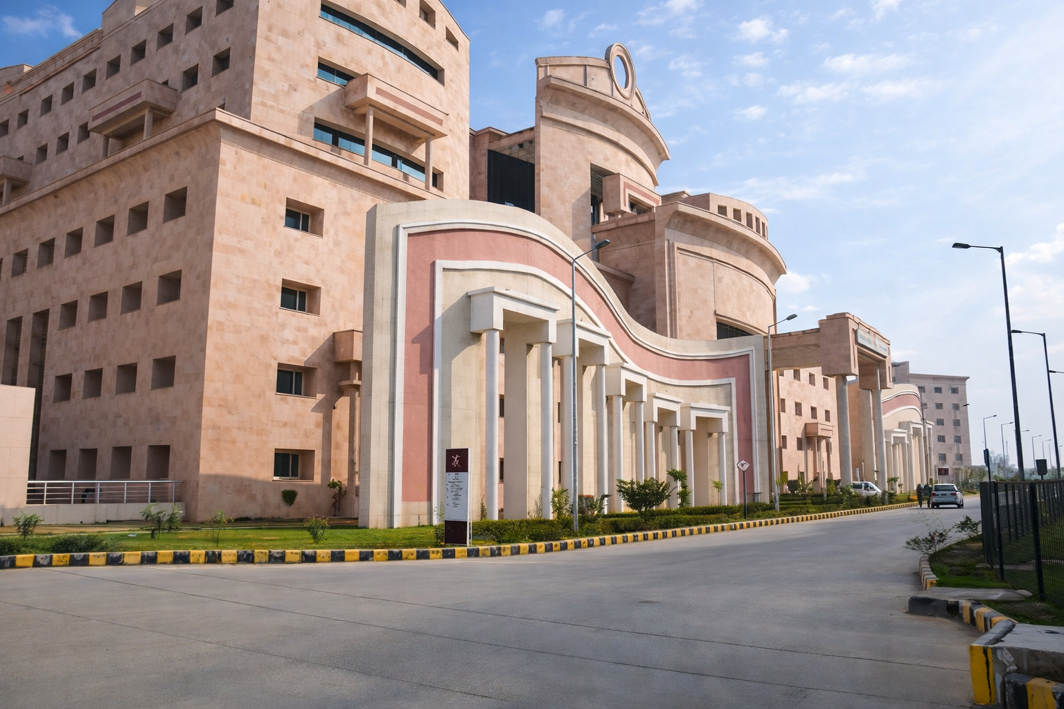 The ESIC 500-bedded Hospital and Medical College at Alwar presents a monumental yet functional architectural character, blending institutional efficiency with civic presence. Clad in warm sandstone hues, the buildings feature bold geometric masses, curved volumes, and recessed fenestrations that respond to the regional climate. The composition is anchored by grand porticos and colonnaded entrances, lending a sense of formality and accessibility. Large glazed openings introduce daylight into critical spaces, while shaded corridors and deep overhangs enhance thermal comfort. The campus planning integrates academic, healthcare, and residential blocks within a cohesive framework, ensuring clarity of movement and a balanced relationship between built form and open spaces.