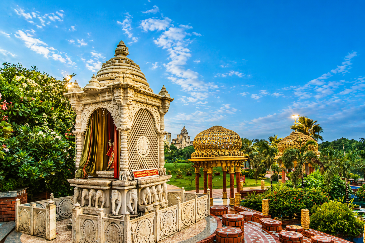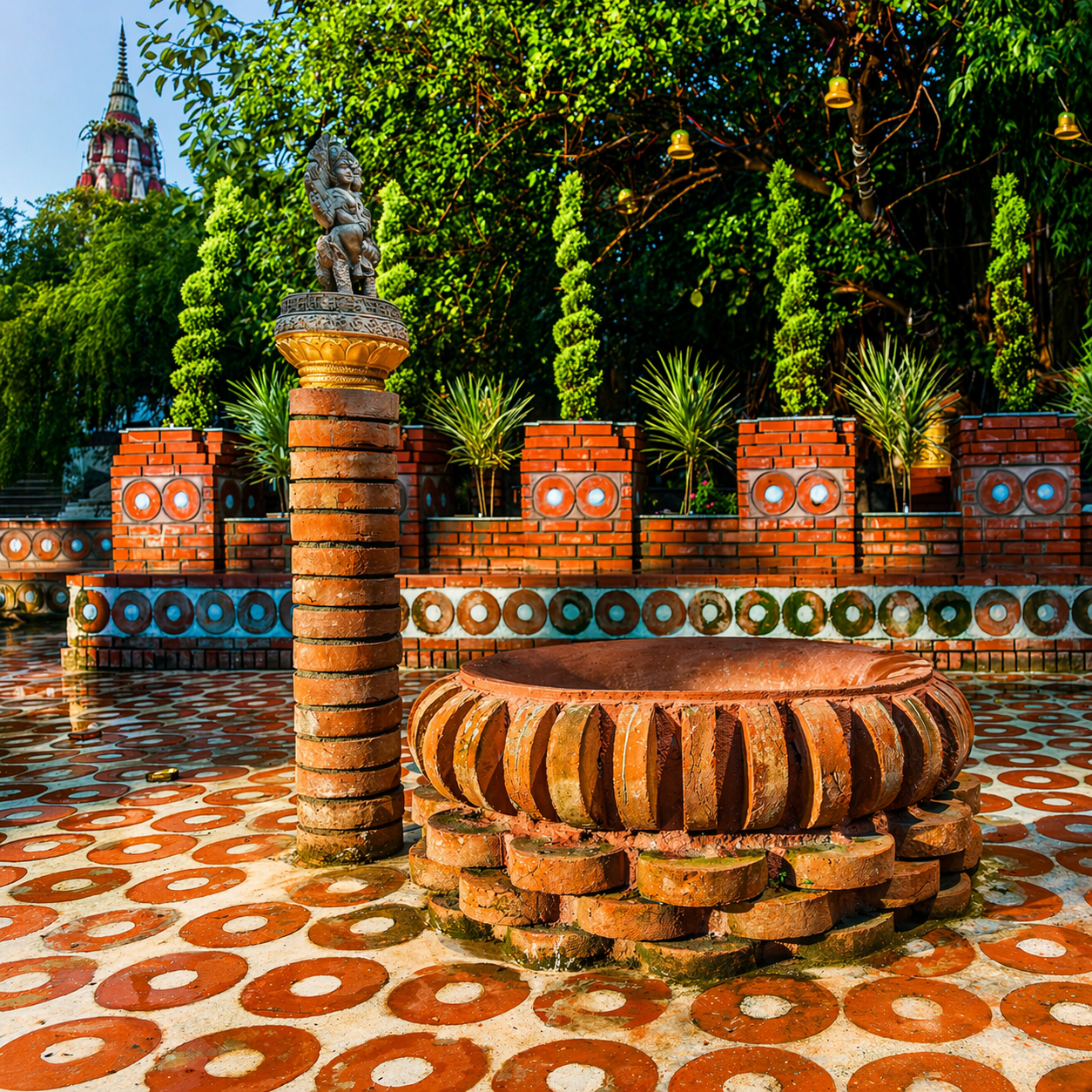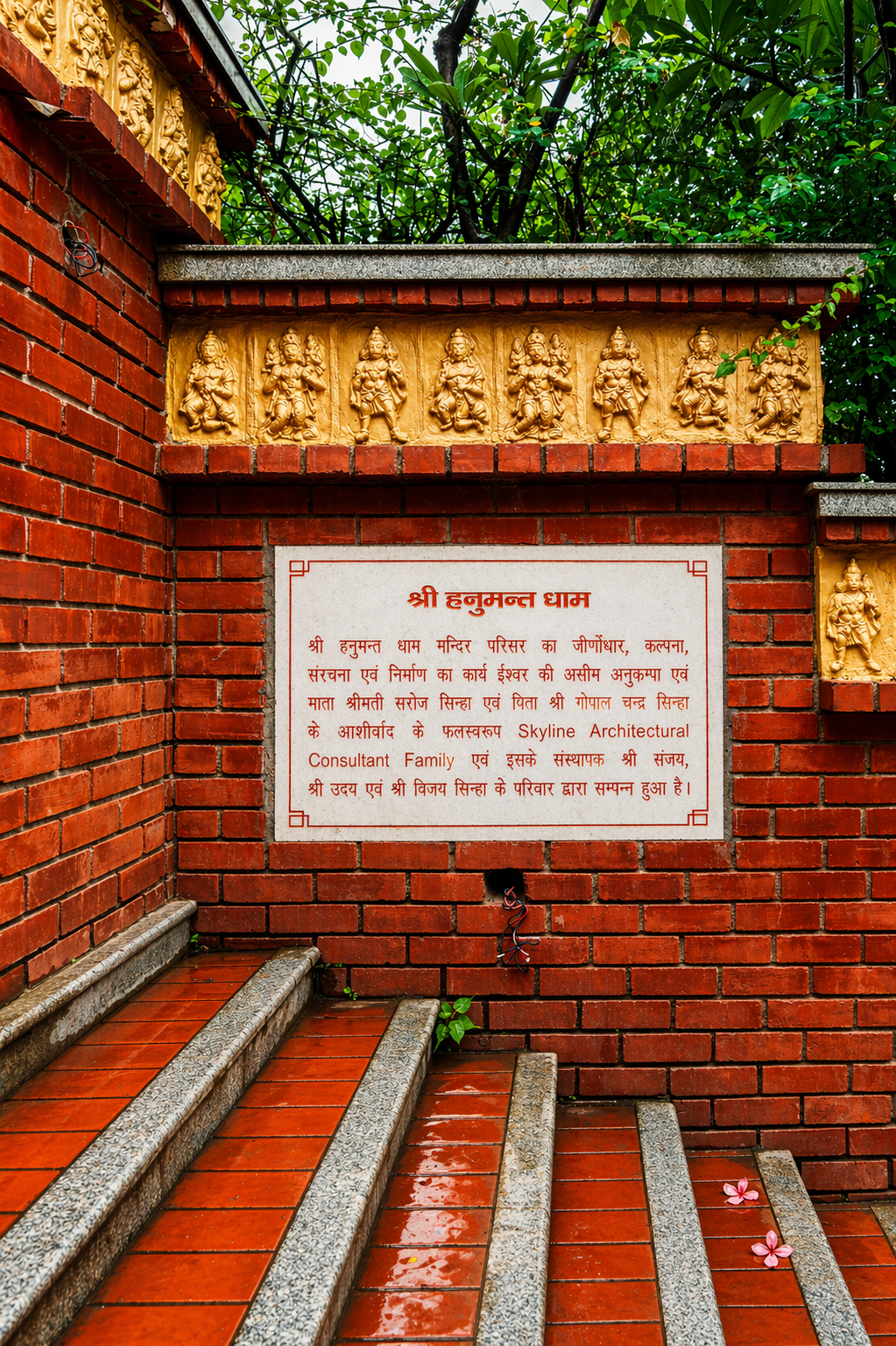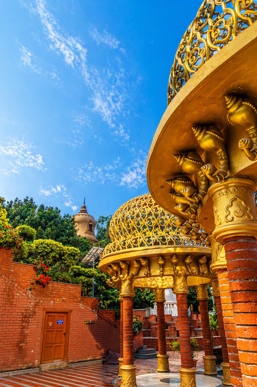 Hanumant Dham Temple, Lucknow expresses a spiritually charged architectural language through a rich interplay of brick masonry, carved stonework and landscape design. The complex is composed as a sequence of ceremonial terraces, stepped pathways, water courts, domed pavilions and sacred shrines, creating a layered journey of devotion and discovery. Ornamental flooring patterns, sculptural elements and finely detailed parapets add visual rhythm, while the dense tree cover and gardens lend calmness and enclosure. The architecture balances monumentality with intimacy, using traditional forms and materials in a highly crafted manner. Overall, the temple precinct feels immersive, symbolic and deeply rooted in cultural expression.