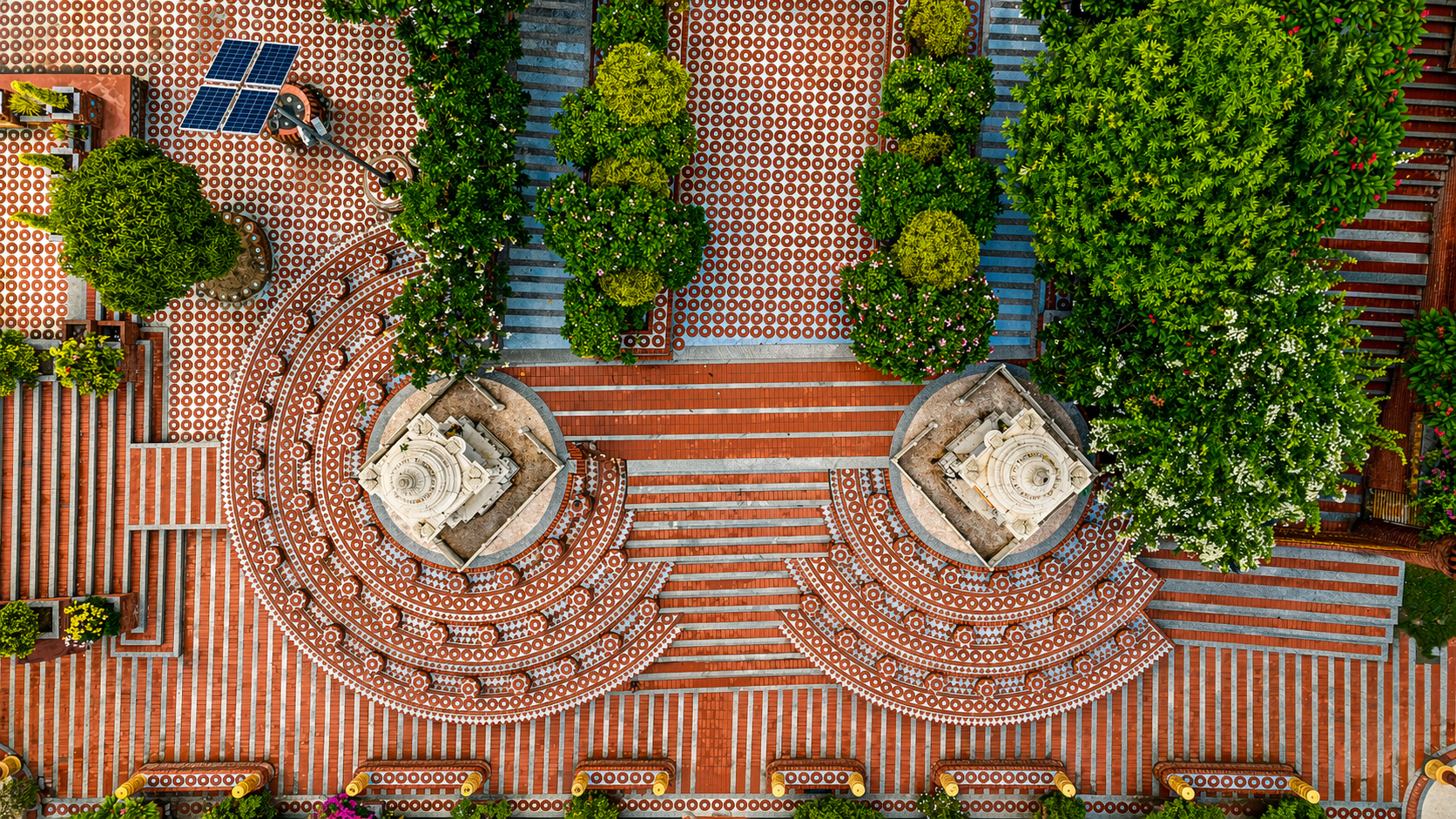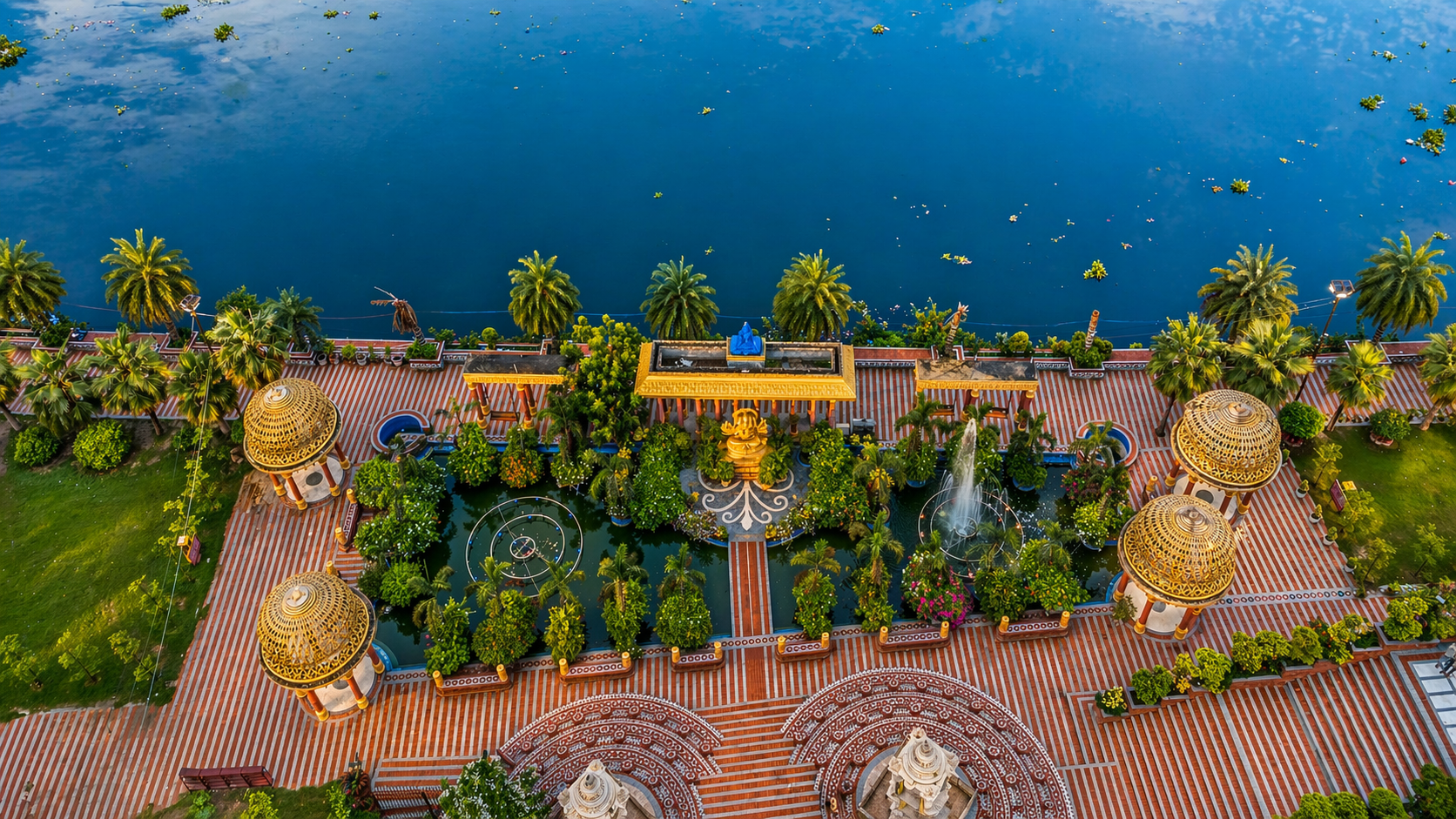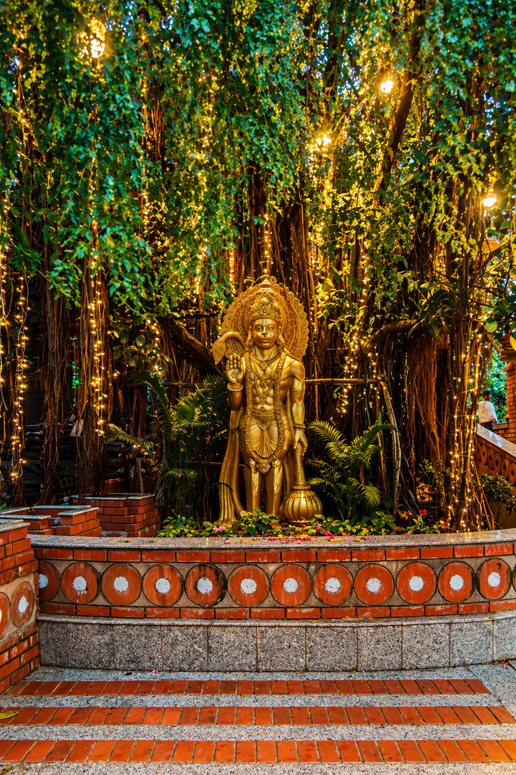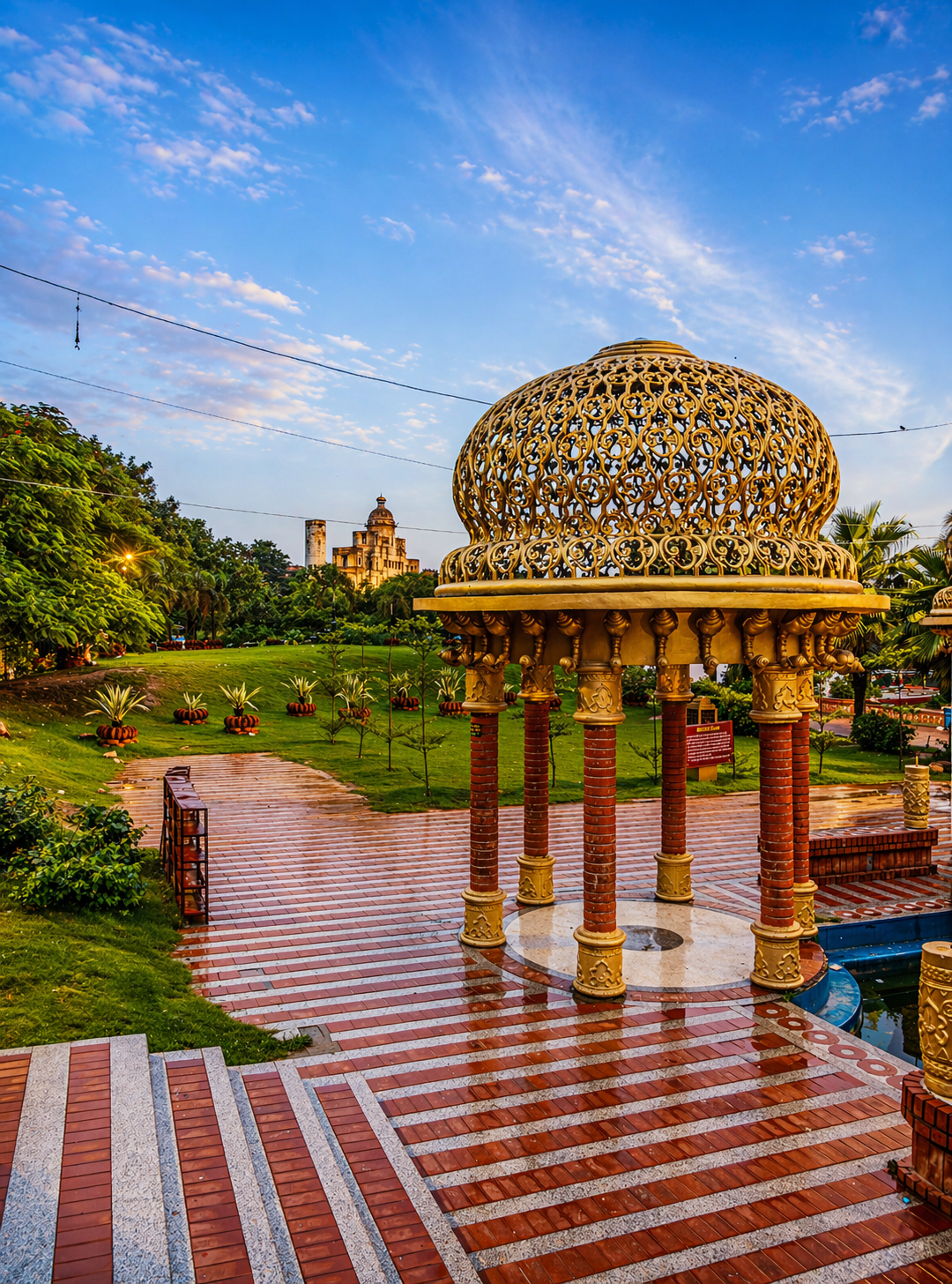 Hanumant Dham Temple, Lucknow expresses a spiritually charged architectural language through a rich interplay of brick masonry, carved stonework and landscape design. The complex is composed as a sequence of ceremonial terraces, stepped pathways, water courts, domed pavilions and sacred shrines, creating a layered journey of devotion and discovery. Ornamental flooring patterns, sculptural elements and finely detailed parapets add visual rhythm, while the dense tree cover and gardens lend calmness and enclosure. The architecture balances monumentality with intimacy, using traditional forms and materials in a highly crafted manner. Overall, the temple precinct feels immersive, symbolic and deeply rooted in cultural expression.