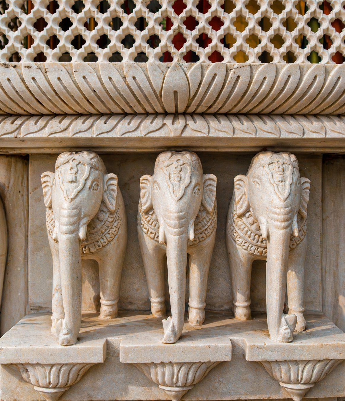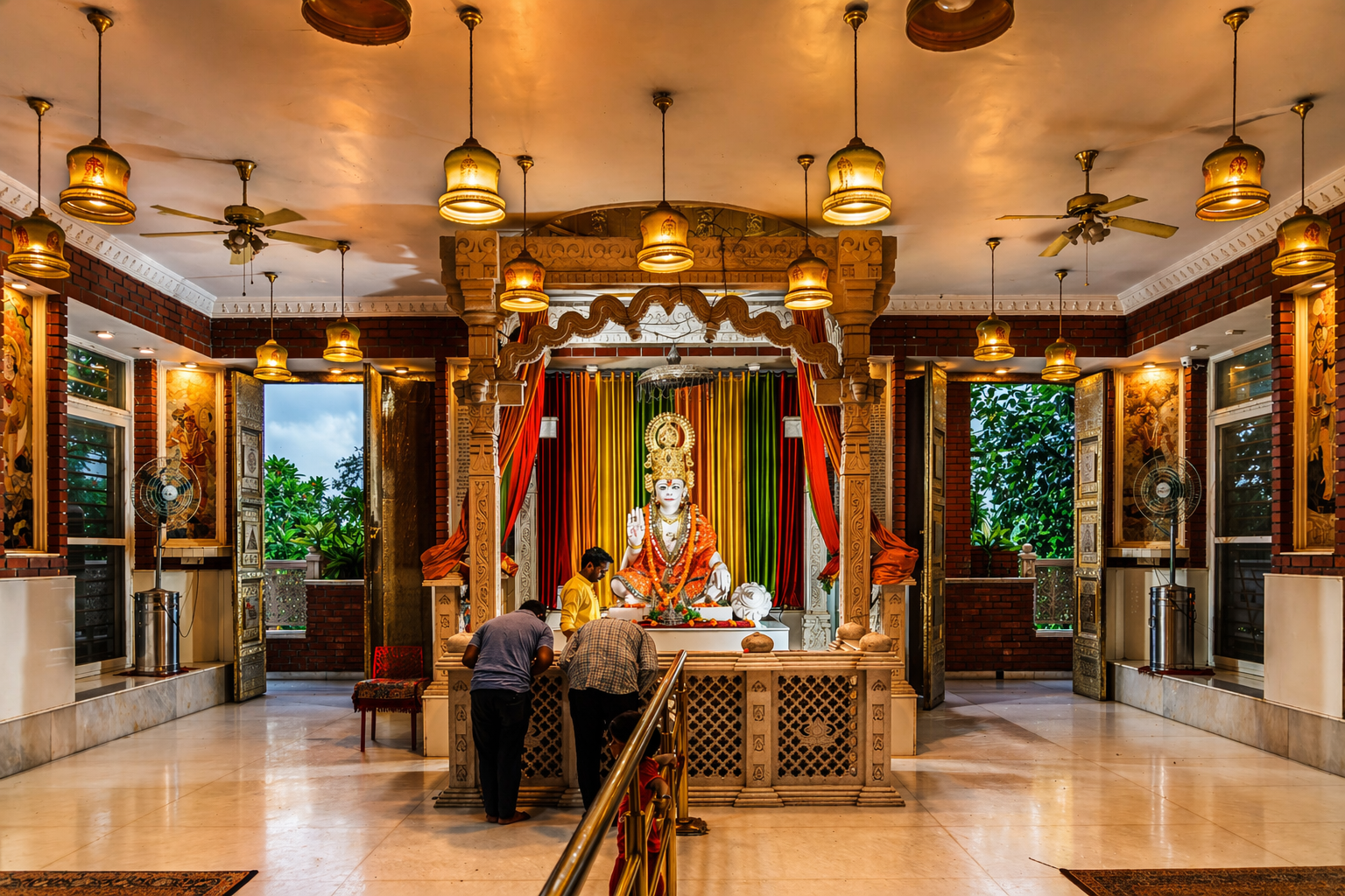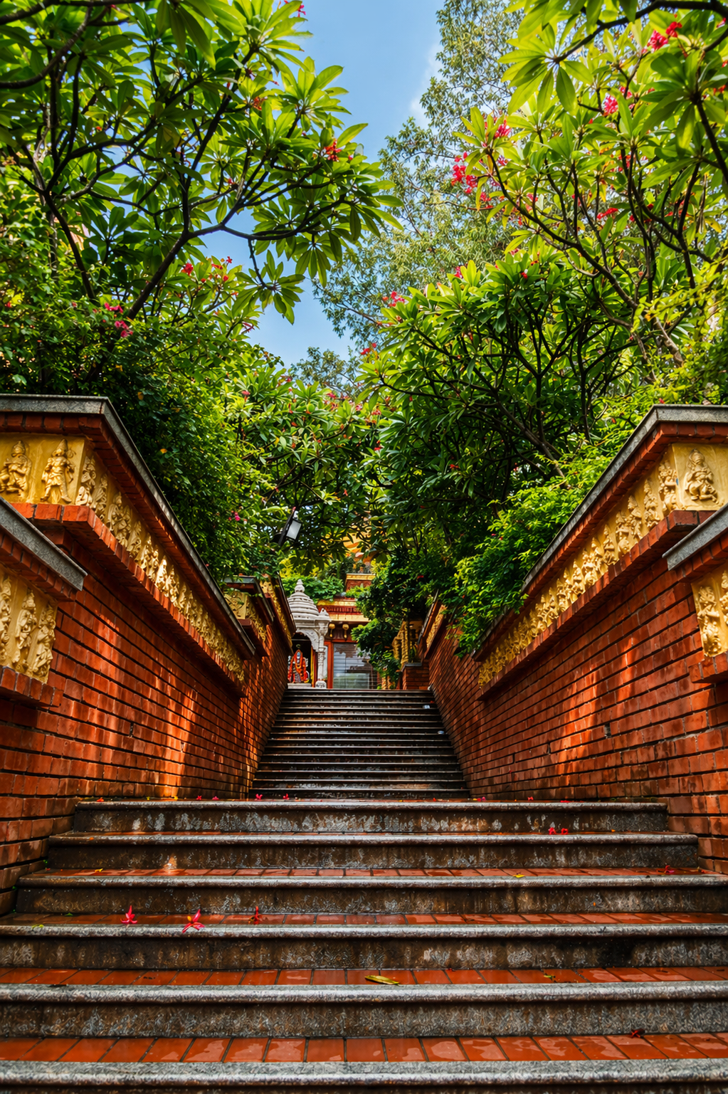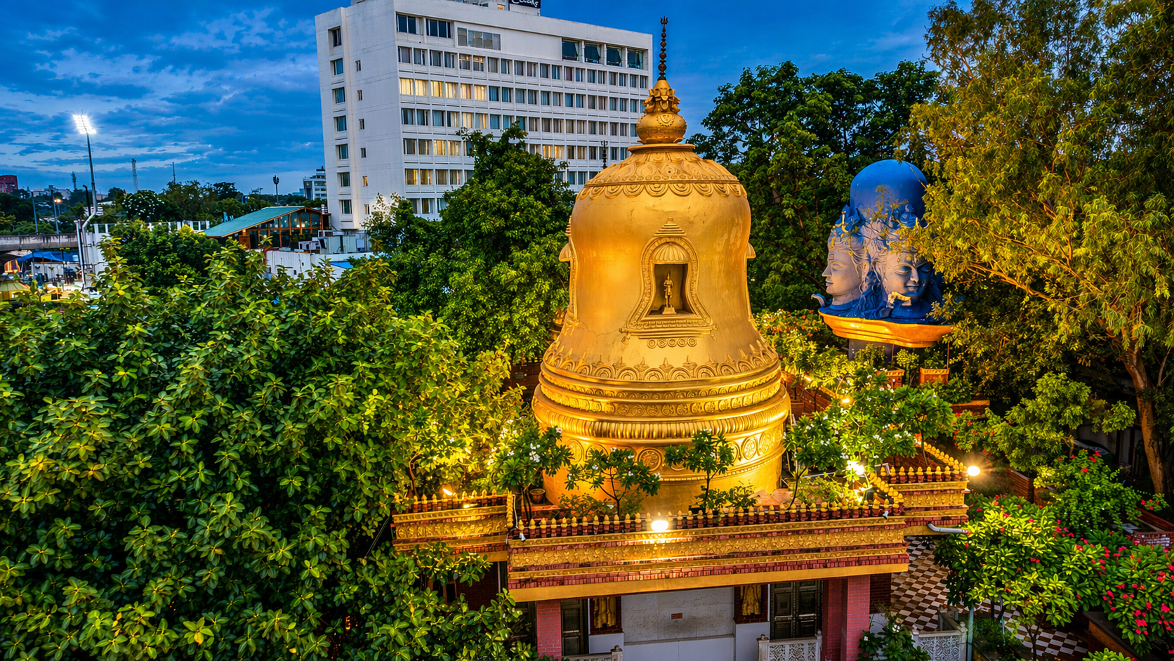 Hanumant Dham Temple, Lucknow expresses a spiritually charged architectural language through a rich interplay of brick masonry, carved stonework and landscape design. The complex is composed as a sequence of ceremonial terraces, stepped pathways, water courts, domed pavilions and sacred shrines, creating a layered journey of devotion and discovery. Ornamental flooring patterns, sculptural elements and finely detailed parapets add visual rhythm, while the dense tree cover and gardens lend calmness and enclosure. The architecture balances monumentality with intimacy, using traditional forms and materials in a highly crafted manner. Overall, the temple precinct feels immersive, symbolic and deeply rooted in cultural expression.