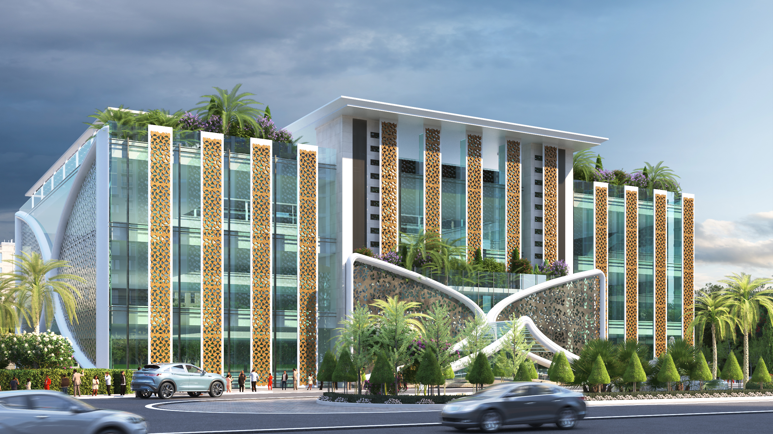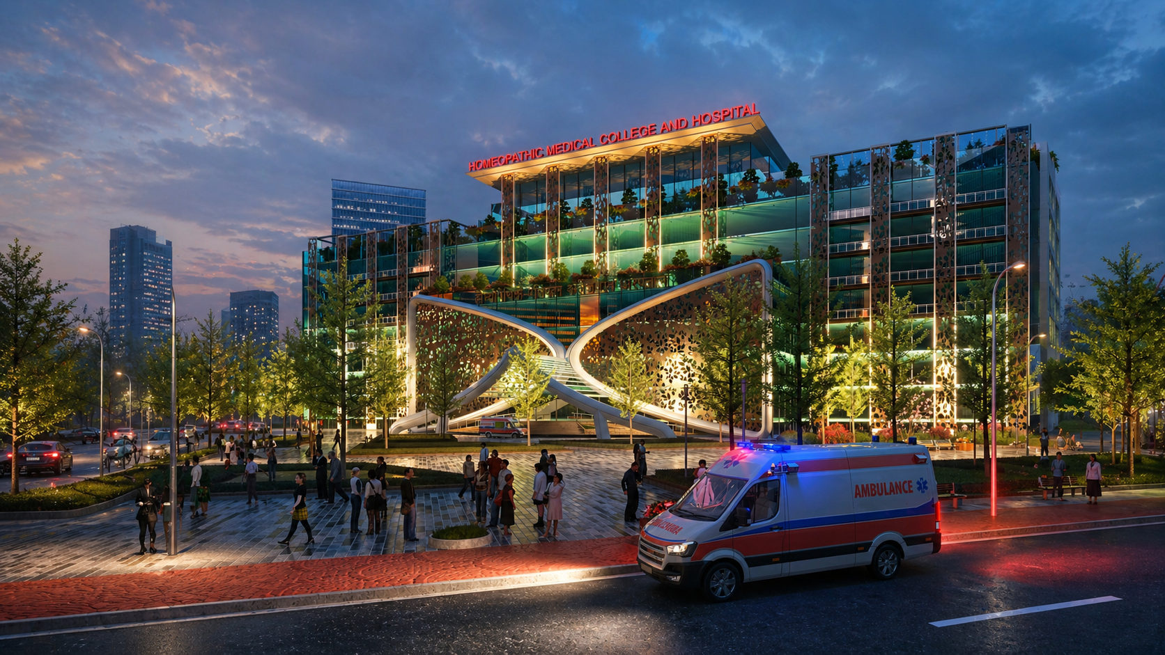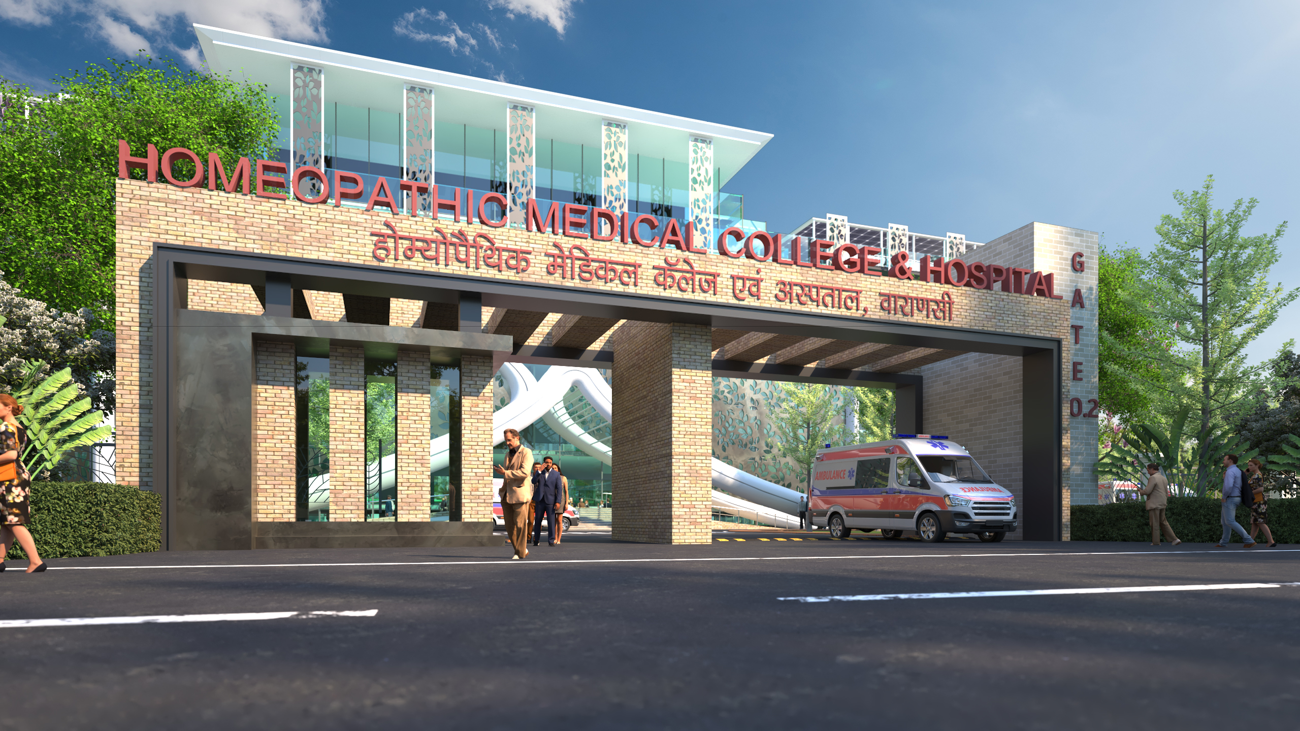 The architecture of Homeopathic Hospital & College, Varanasi reflects a contemporary institutional language enriched with biophilic design elements. The building is composed with clean horizontal masses, expansive glazed façades and a rhythmic arrangement of vertical decorative fins that lend depth and elegance to the elevation. A striking sculptural feature at the entrance creates a strong visual identity while also softening the institutional character of the complex. Landscaped terraces, rooftop planting and integrated greenery enhance the healing ambience and connect the built form with nature. Overall, the design presents a fresh, transparent and environmentally responsive image suited to an academic and healthcare campus.