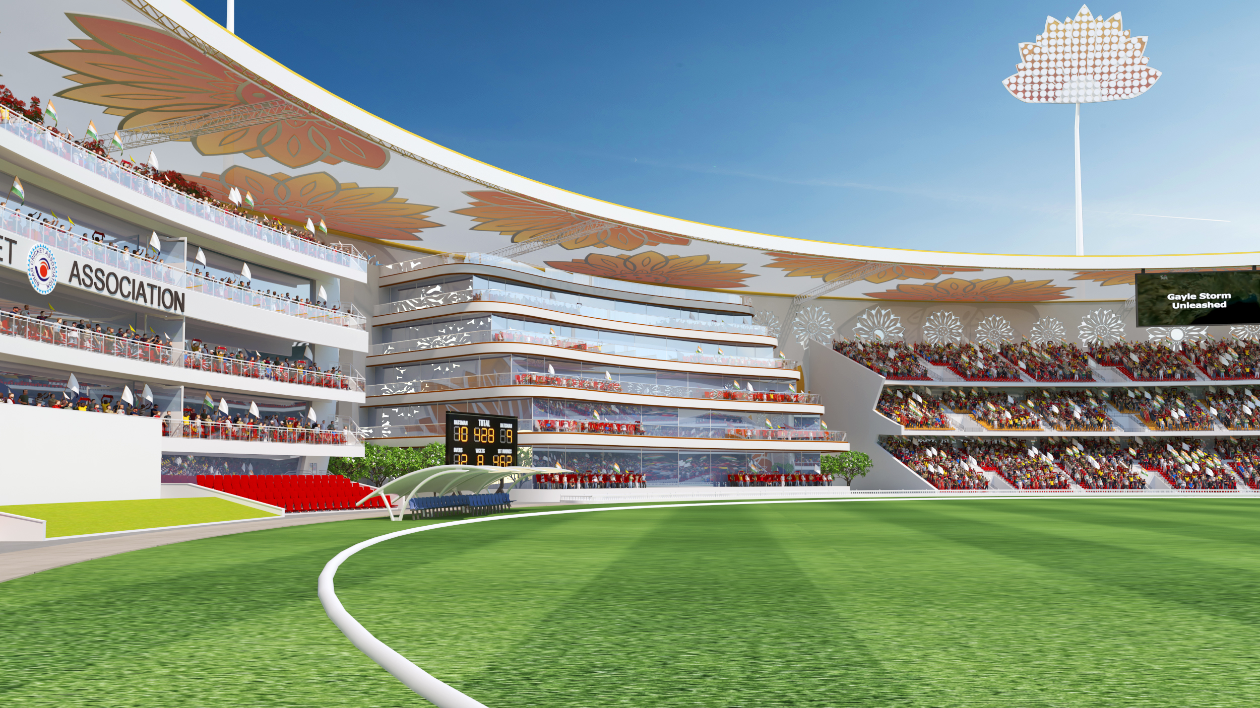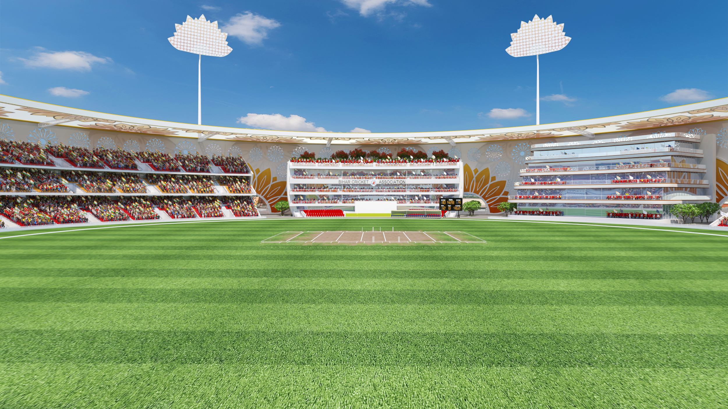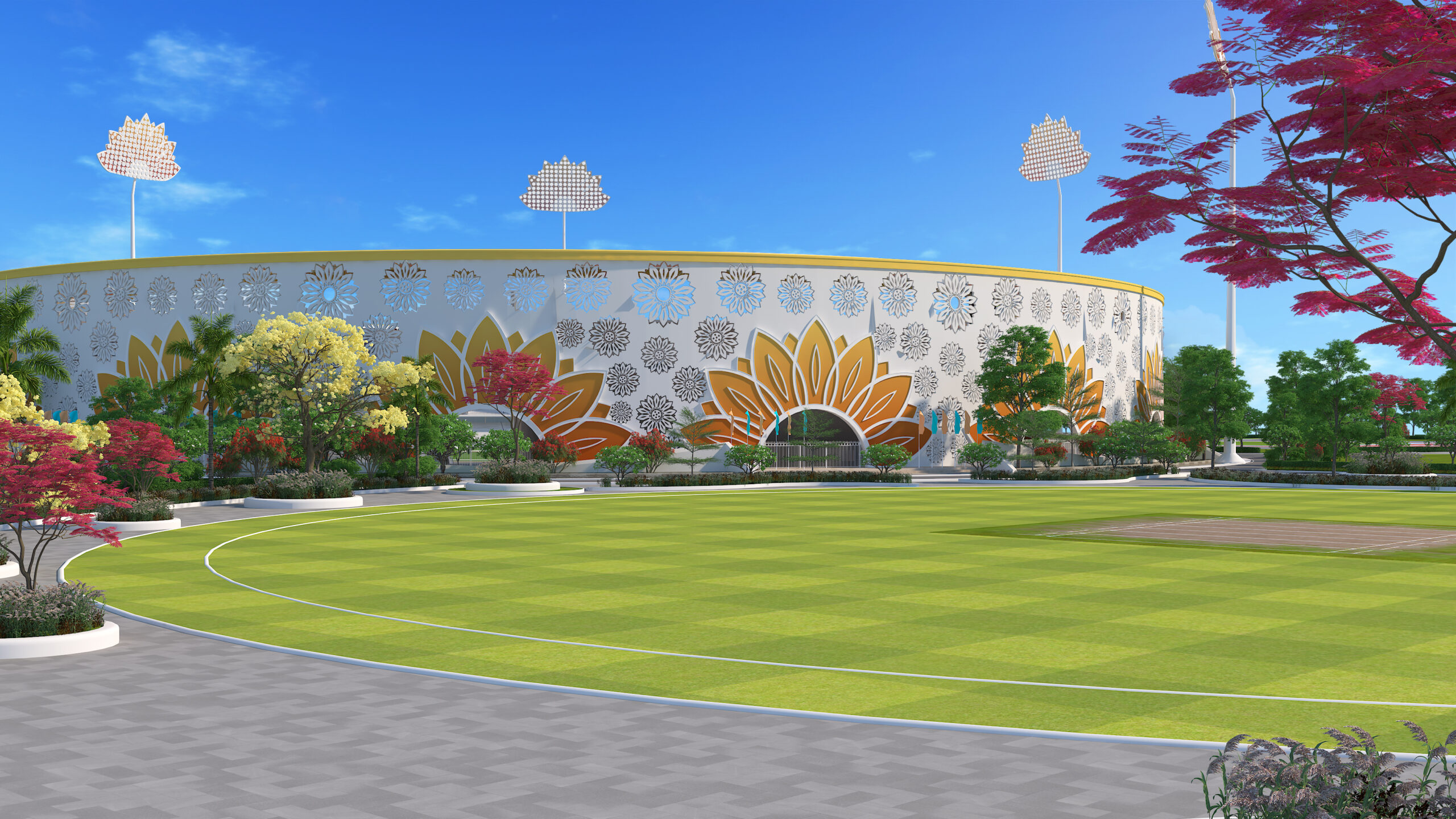 Designed as a contemporary arena that celebrates the spirit of cricket, this stadium merges modern sports infrastructure with cultural identity. The circular form ensures uninterrupted sightlines and an immersive spectator experience, while the architectural facade draws inspiration from traditional floral motifs, creating a distinctive visual language rooted in regional heritage. The stadium integrates world-class playing facilities, multi-tier spectator seating, premium hospitality lounges, and corporate viewing boxes to deliver a complete sporting environment. Thoughtfully planned landscape zones, pedestrian circulation, and recreational areas extend the stadium experience beyond the game, transforming it into a vibrant public destination. More than a venue for matches, the project envisions a landmark that reflects the energy of sport, community engagement, and architectural expression.