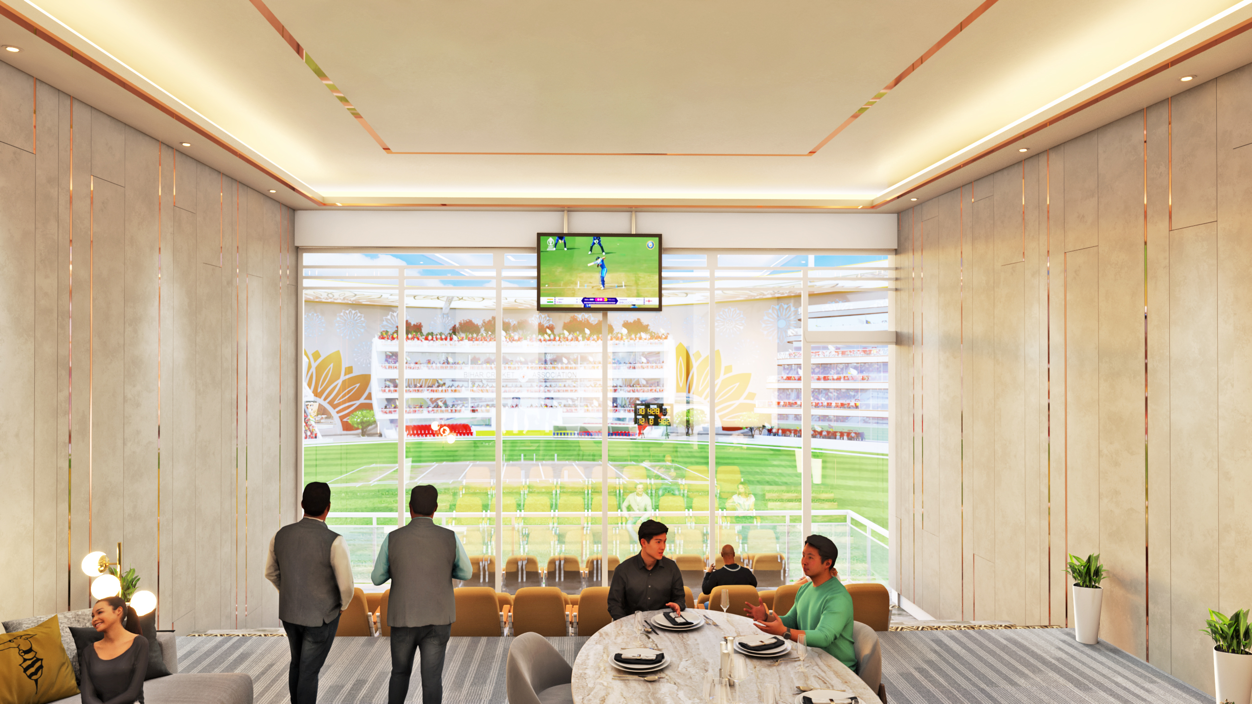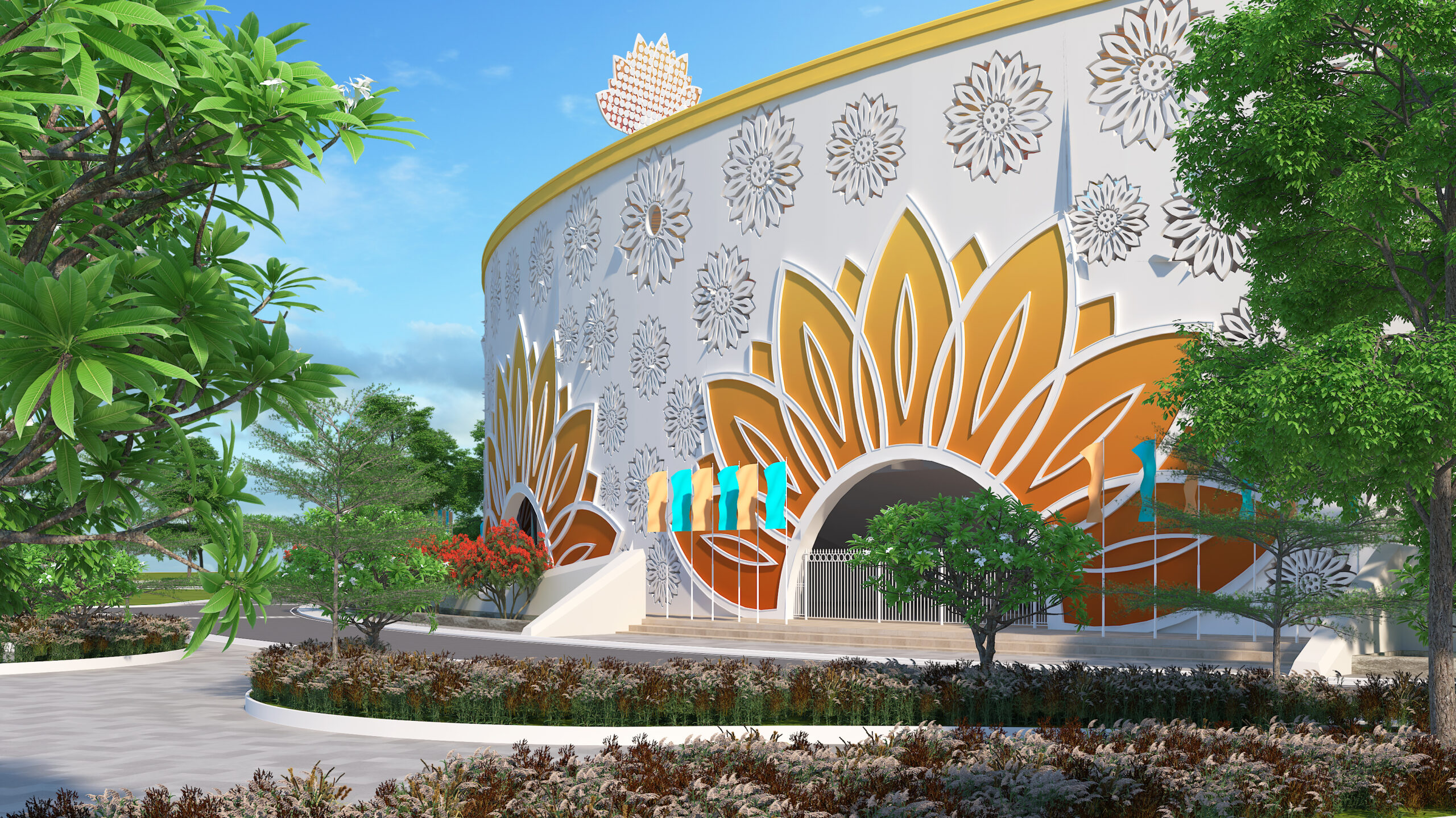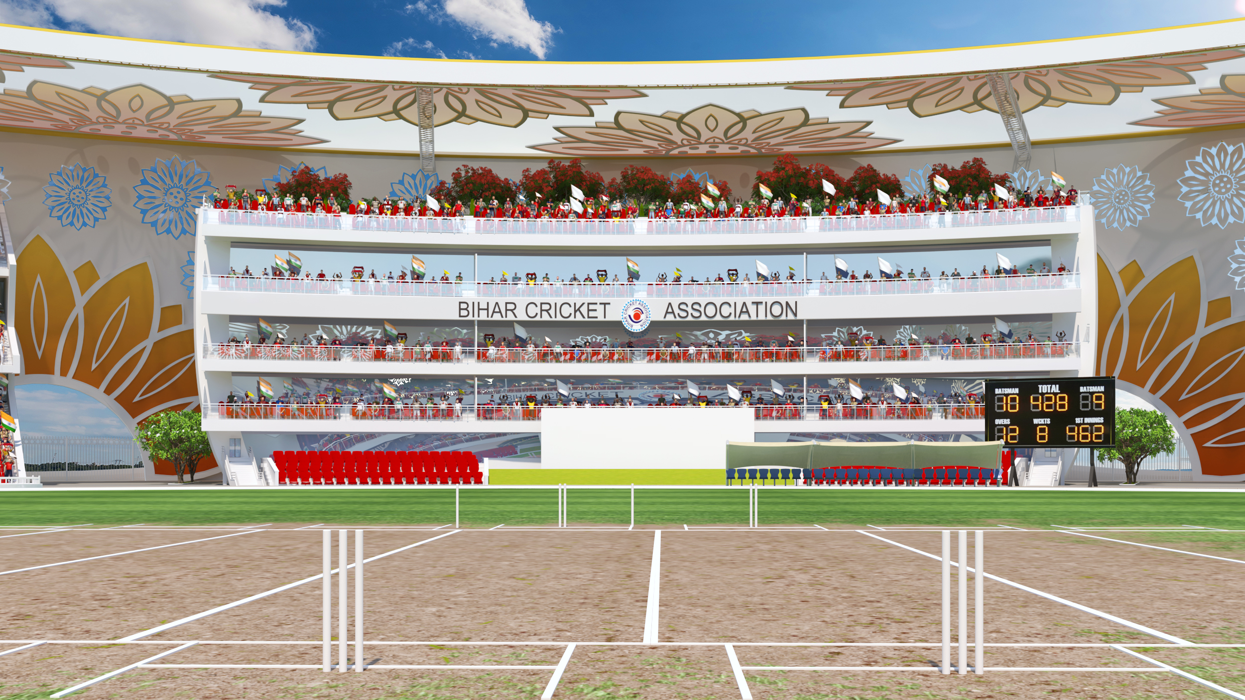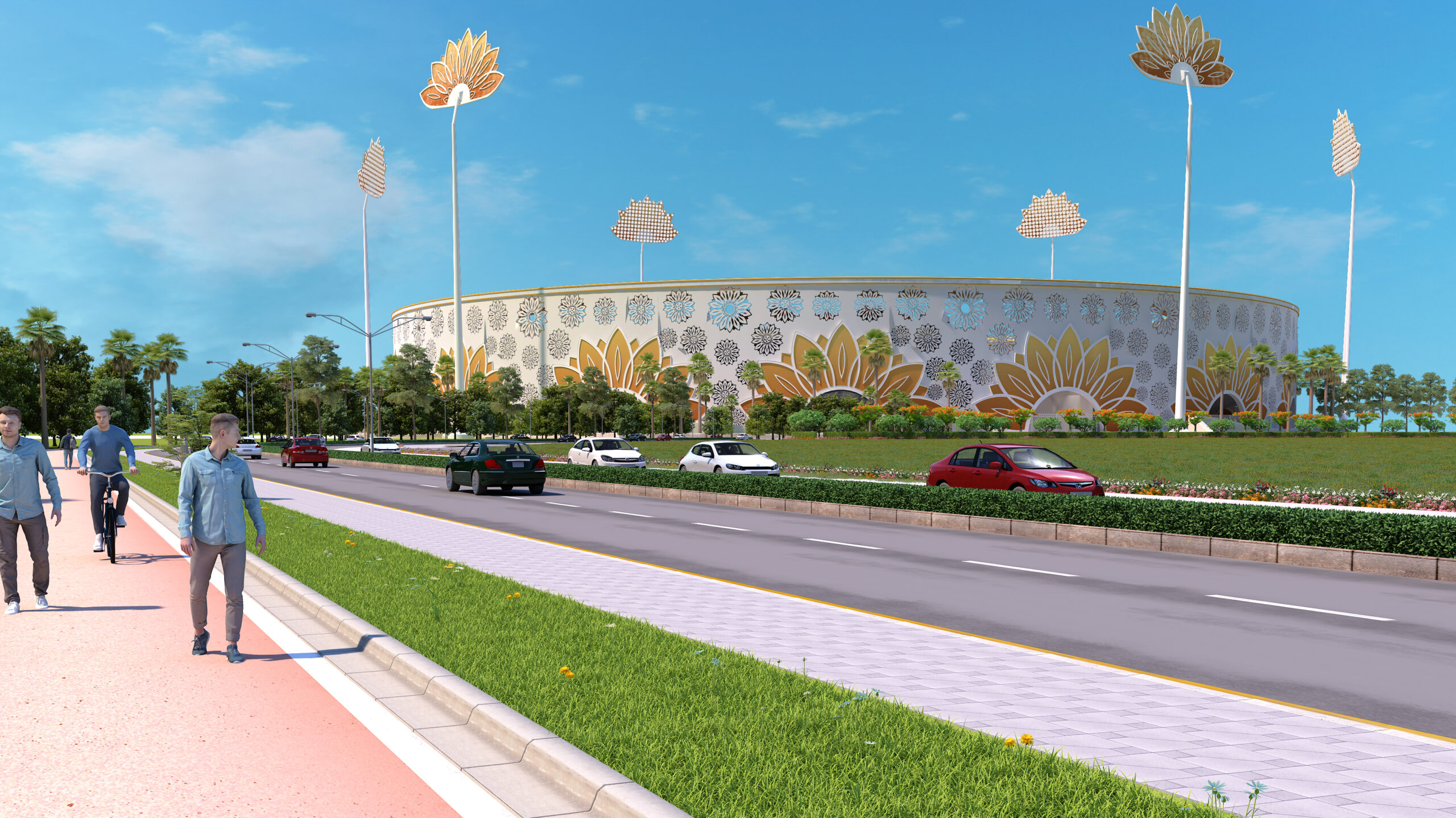 Designed as a contemporary arena that celebrates the spirit of cricket, this stadium merges modern sports infrastructure with cultural identity. The circular form ensures uninterrupted sightlines and an immersive spectator experience, while the architectural facade draws inspiration from traditional floral motifs, creating a distinctive visual language rooted in regional heritage. The stadium integrates world-class playing facilities, multi-tier spectator seating, premium hospitality lounges, and corporate viewing boxes to deliver a complete sporting environment. Thoughtfully planned landscape zones, pedestrian circulation, and recreational areas extend the stadium experience beyond the game, transforming it into a vibrant public destination. More than a venue for matches, the project envisions a landmark that reflects the energy of sport, community engagement, and architectural expression.