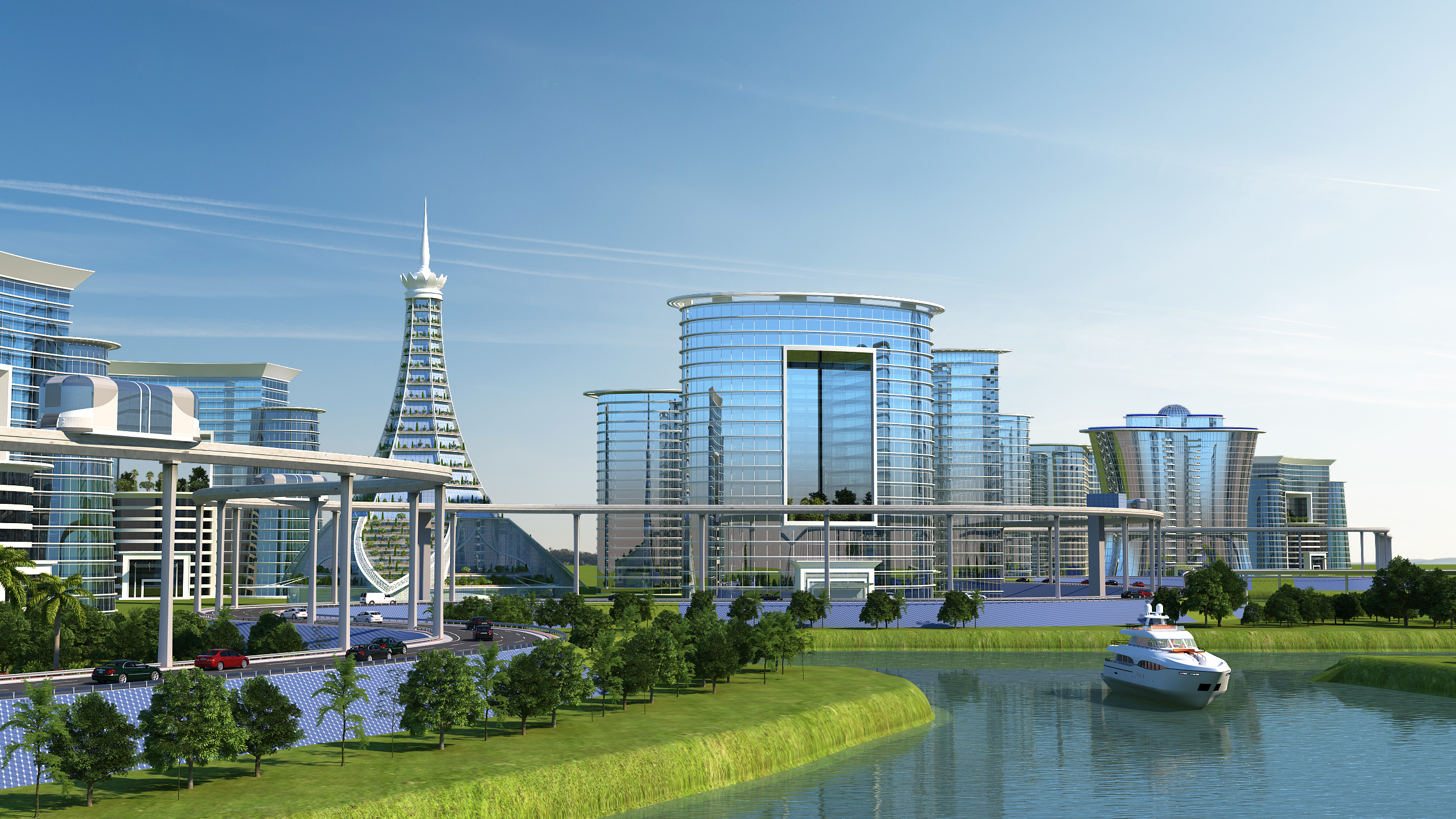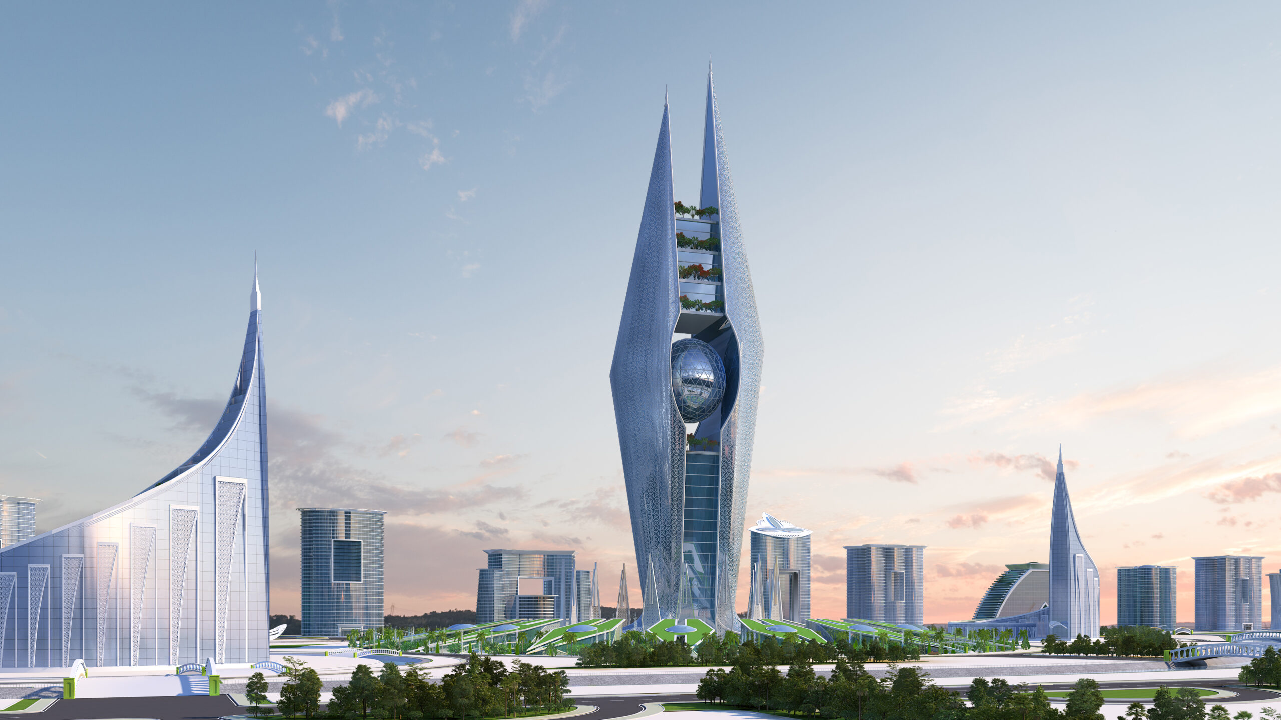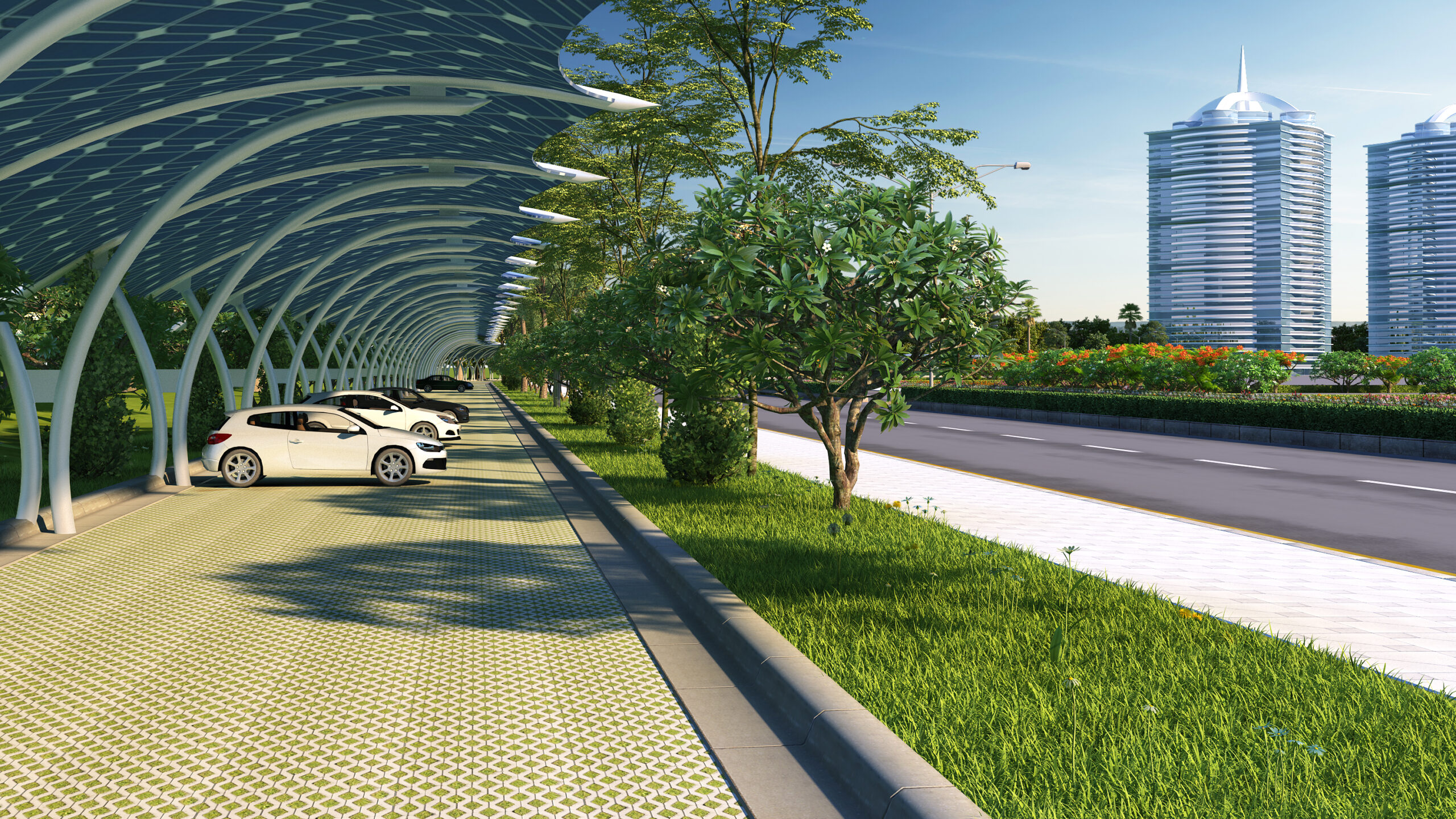 Prabandh Nagar Yojna at Lucknow is imagined as a bold, future-oriented urban development defined by iconic skyline elements and an integrated master-planned structure. The architecture blends landmark towers, curved high-rise residences and organized low-rise neighborhoods within a richly landscaped setting. Extensive glass facades, aerodynamic forms and elevated connectors give the development a distinctly contemporary identity. Water channels, central greens and wide ceremonial avenues reinforce spatial order and visual continuity across the township. The residential clusters are arranged around community-focused open spaces, creating a balanced relationship between density and livability. Overall, the scheme presents an ambitious, modern and visually memorable model of urban growth.