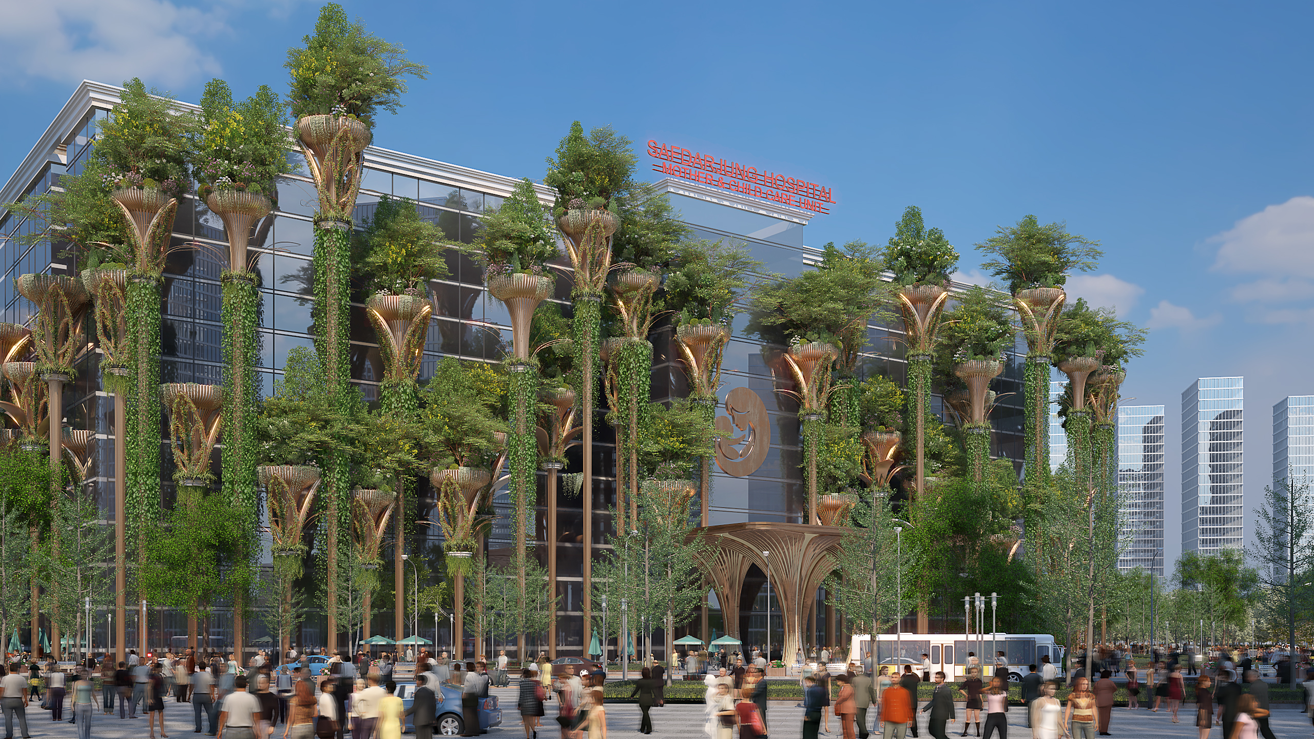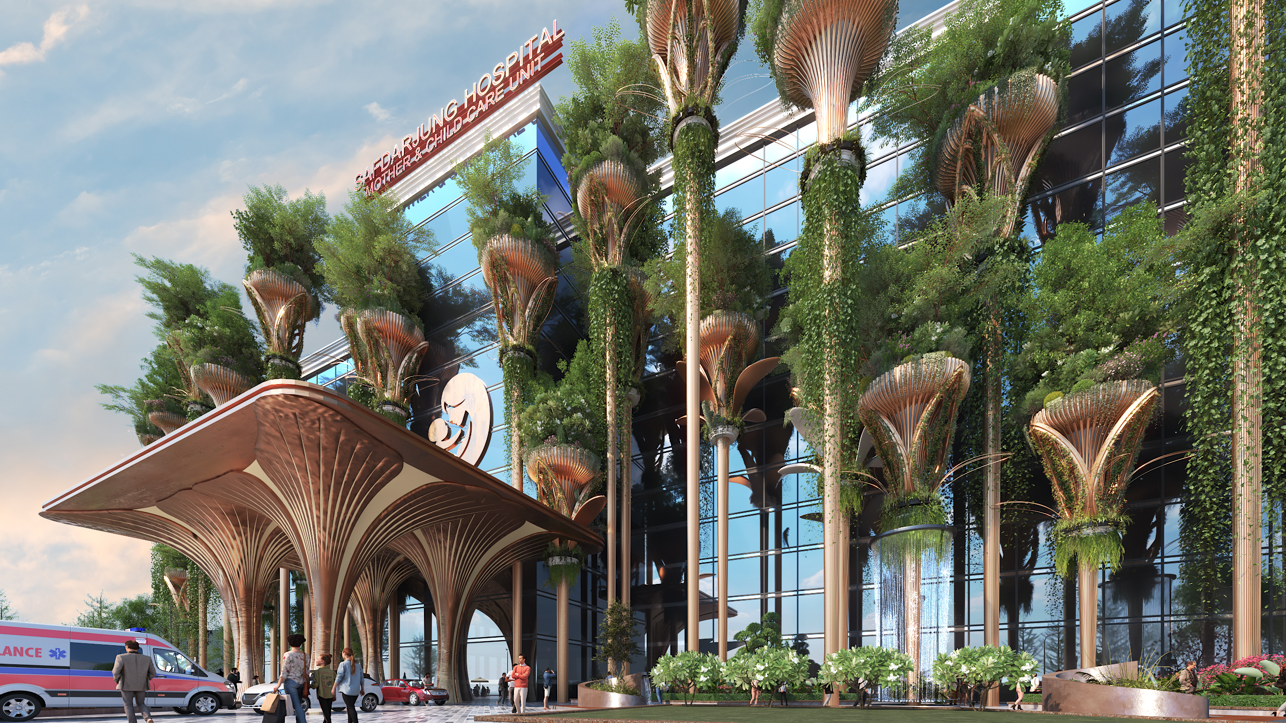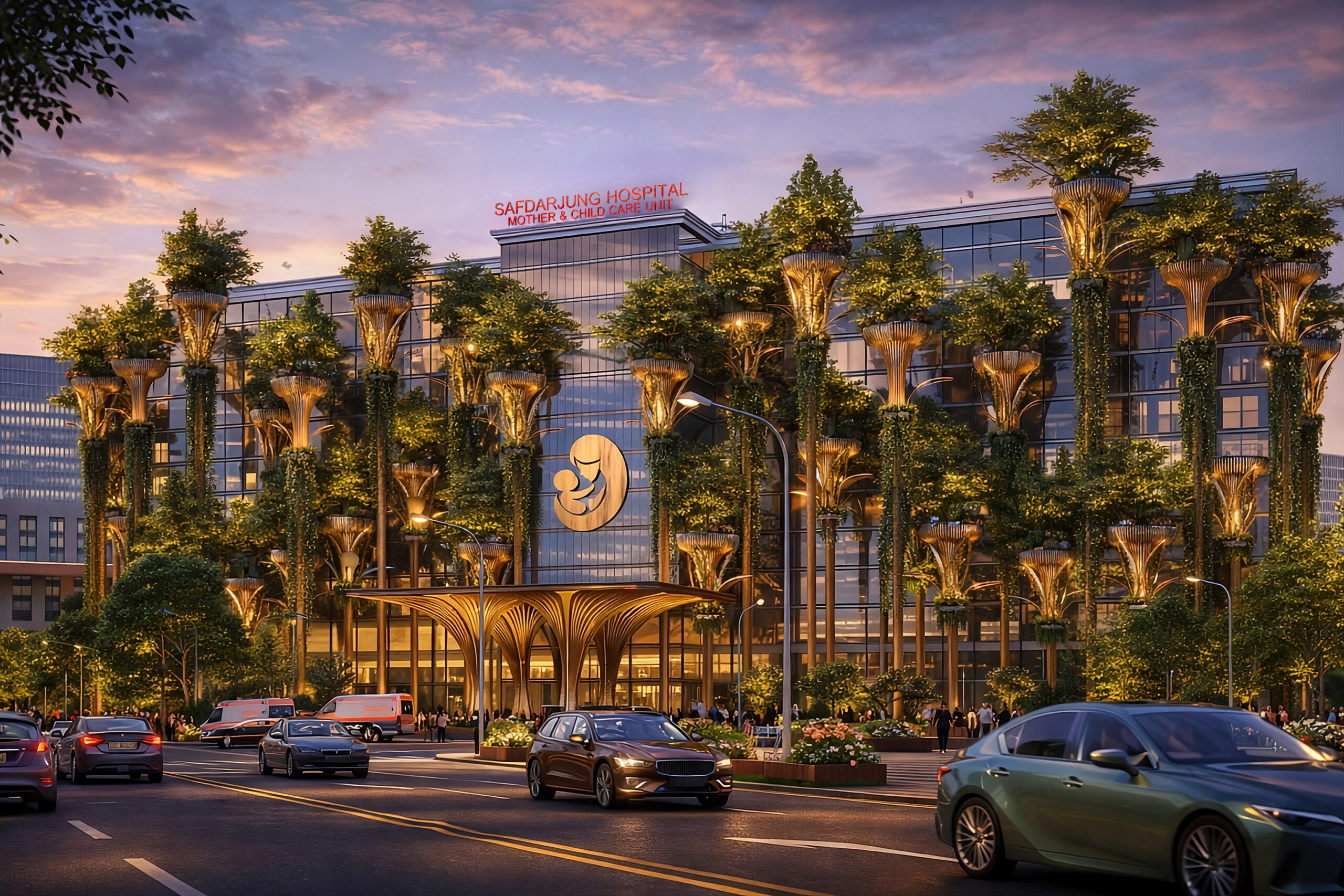 Safdarjung Hospital, New Delhi presents a striking vision of biophilic healthcare architecture, where a contemporary glass façade is softened by a forest of vertical green structures. Tree-like columns carrying planters and cascading vines transform the elevation into a living therapeutic screen, giving the building a distinctive identity. The entrance canopy adopts an organic branching form, creating a welcoming civic gesture while shading the drop-off zone. Transparent surfaces, integrated planting, water features and generous public forecourts suggest openness, healing and environmental responsiveness. Altogether, the design merges technology, landscape and symbolism to create a progressive mother-and-child care facility with a memorable urban presence overall.