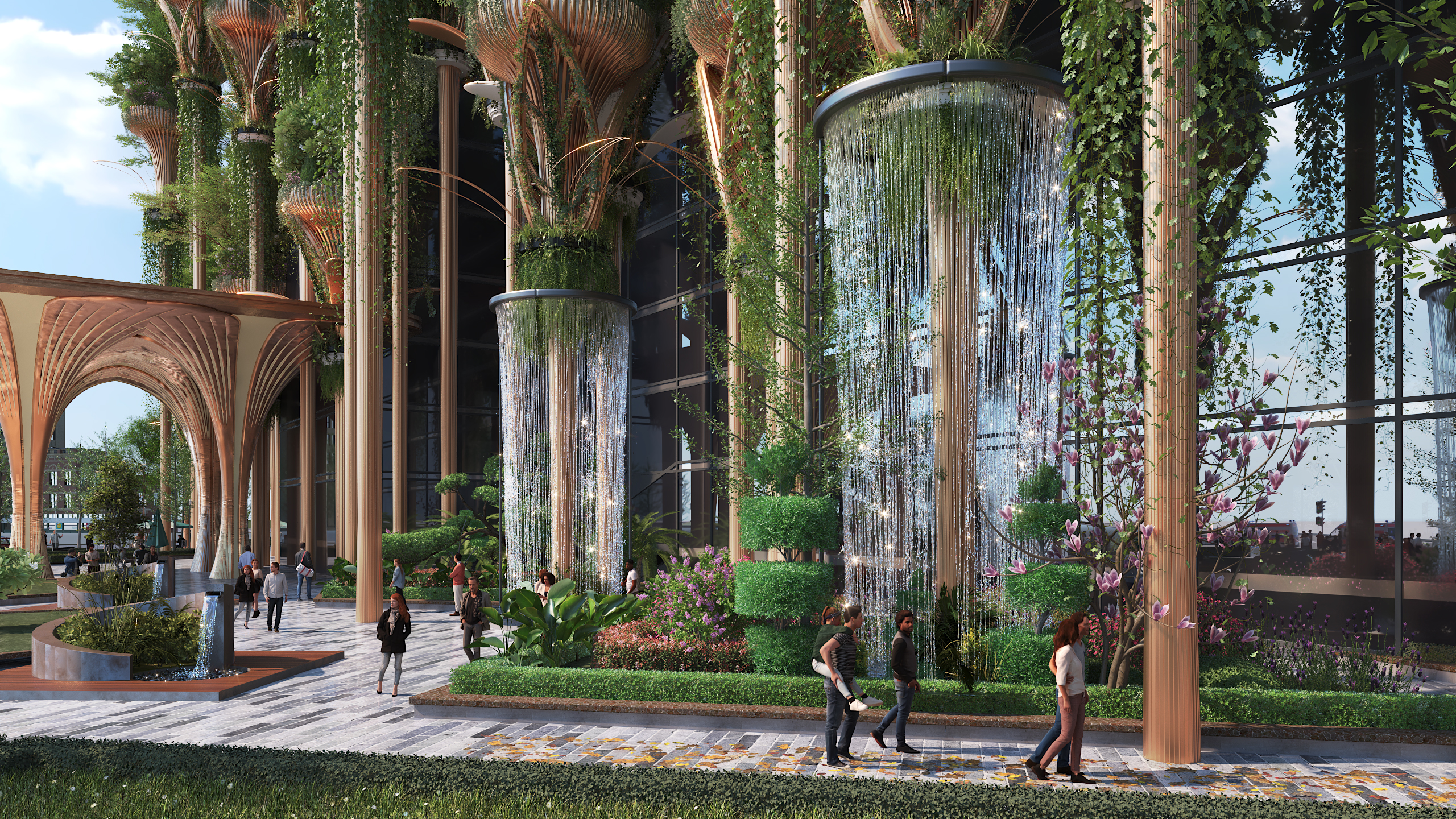 The hospital is imagined as a green urban landmark defined by reflective glazing, sculptural planter towers and an elegant bio-inspired porch. Instead of a conventional institutional façade, the design creates a lush healing envelope that feels humane and forward-looking. Rich landscaping, vertical vegetation and fluid structural forms give the complex a calm, restorative character.