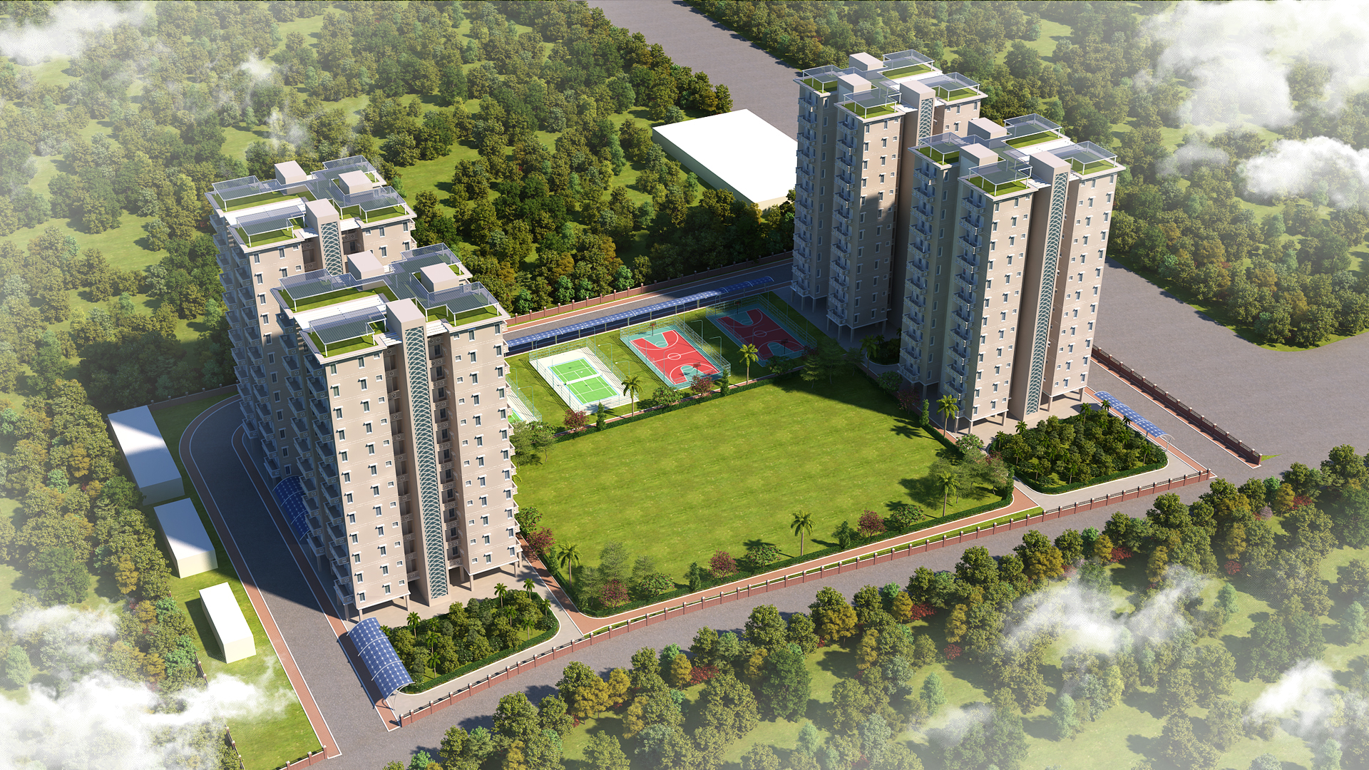 The Transit Hostel at Aligarh is conceived as a contemporary residential enclave that balances efficiency, comfort, and spatial clarity for short-term occupants. Organized as a cluster of mid-rise blocks, the design frames a generous central greenscape activated with recreational courts and community amenities. The planning emphasizes permeability, natural light, and cross-ventilation, ensuring healthy living environments. Circulation is streamlined through well-defined access points and pedestrian-friendly pathways. Unit layouts are compact yet functional, integrating private and shared spaces with clarity. Materiality and façade articulation adopt a restrained modern language, creating a cohesive architectural identity that responds sensitively to the surrounding urban fabric.
