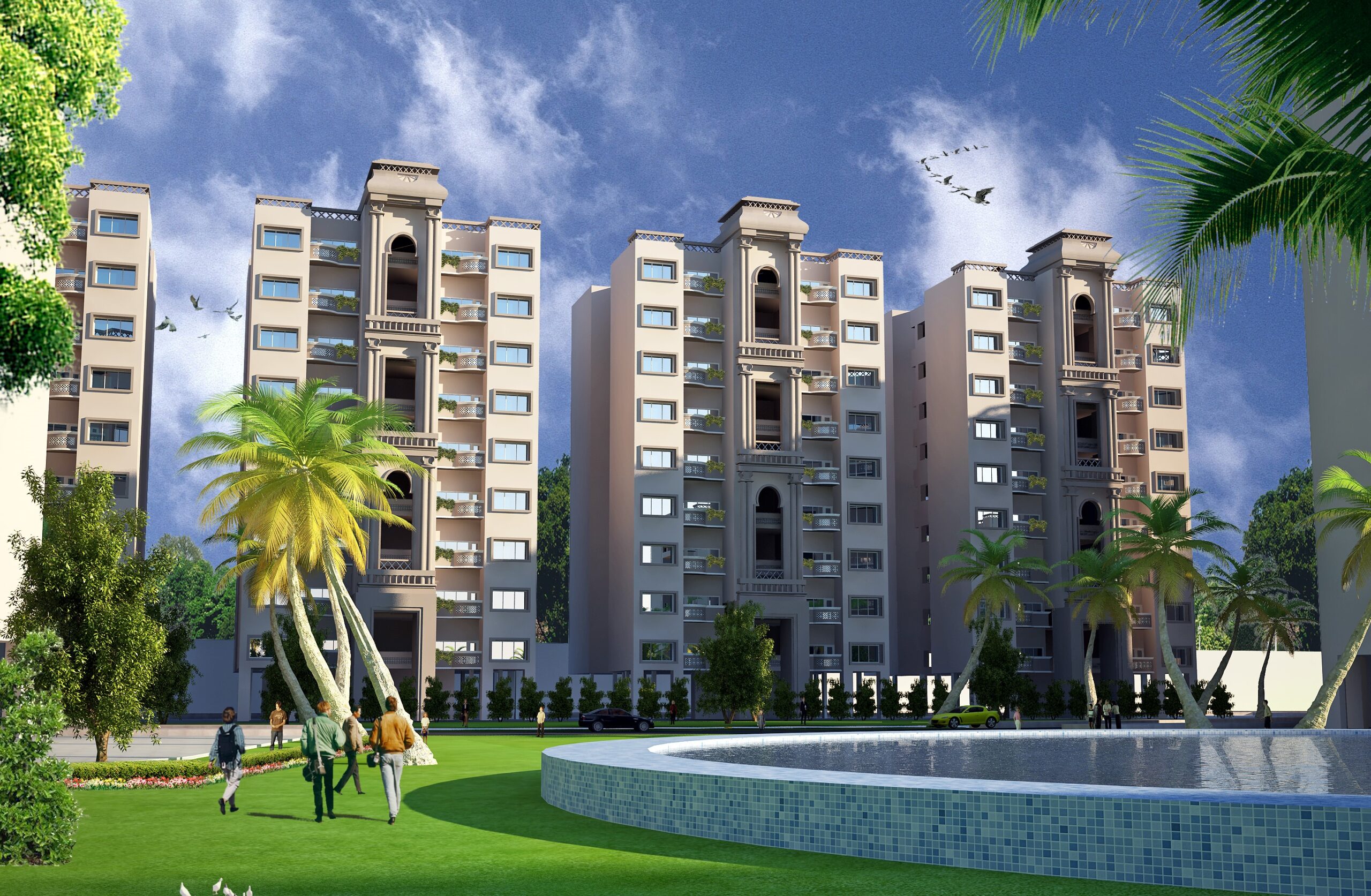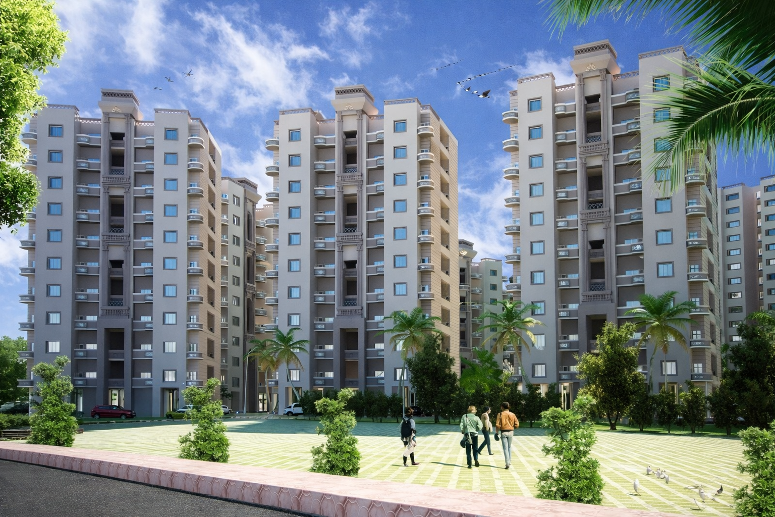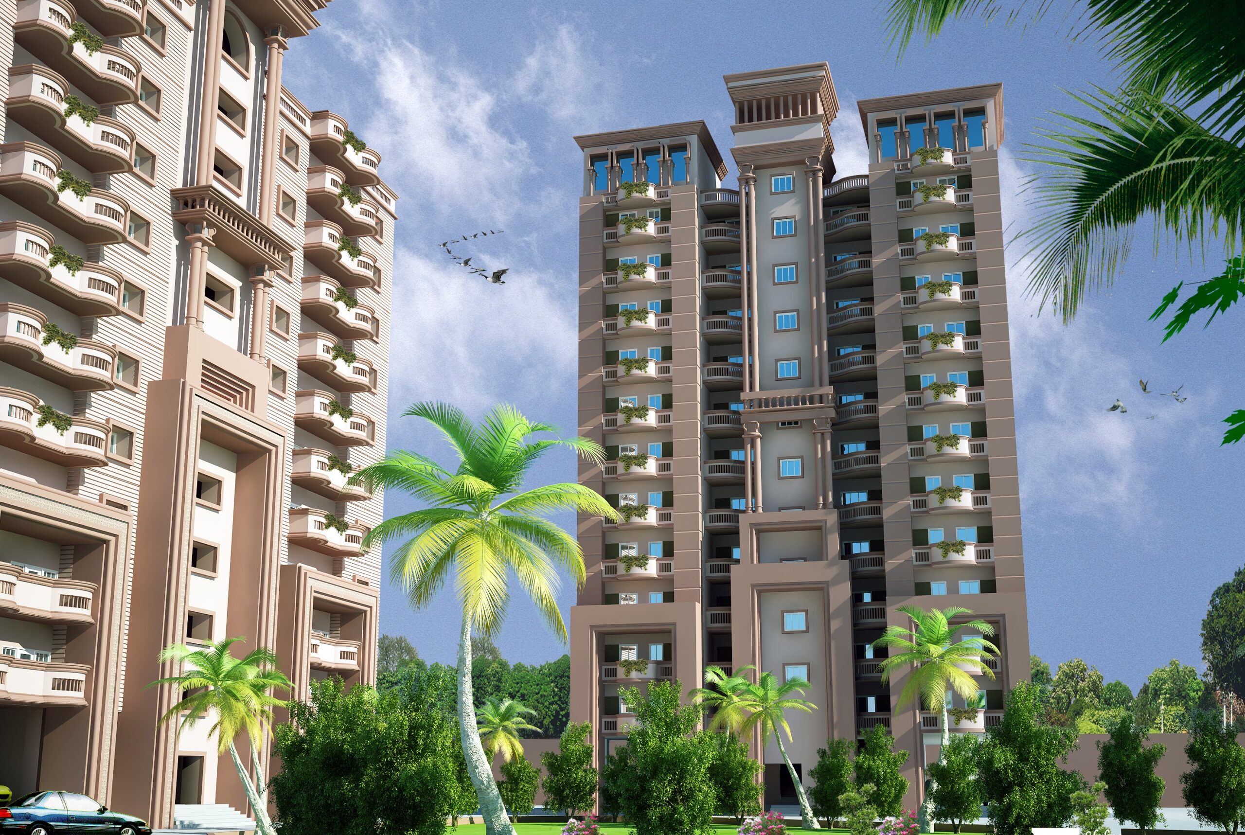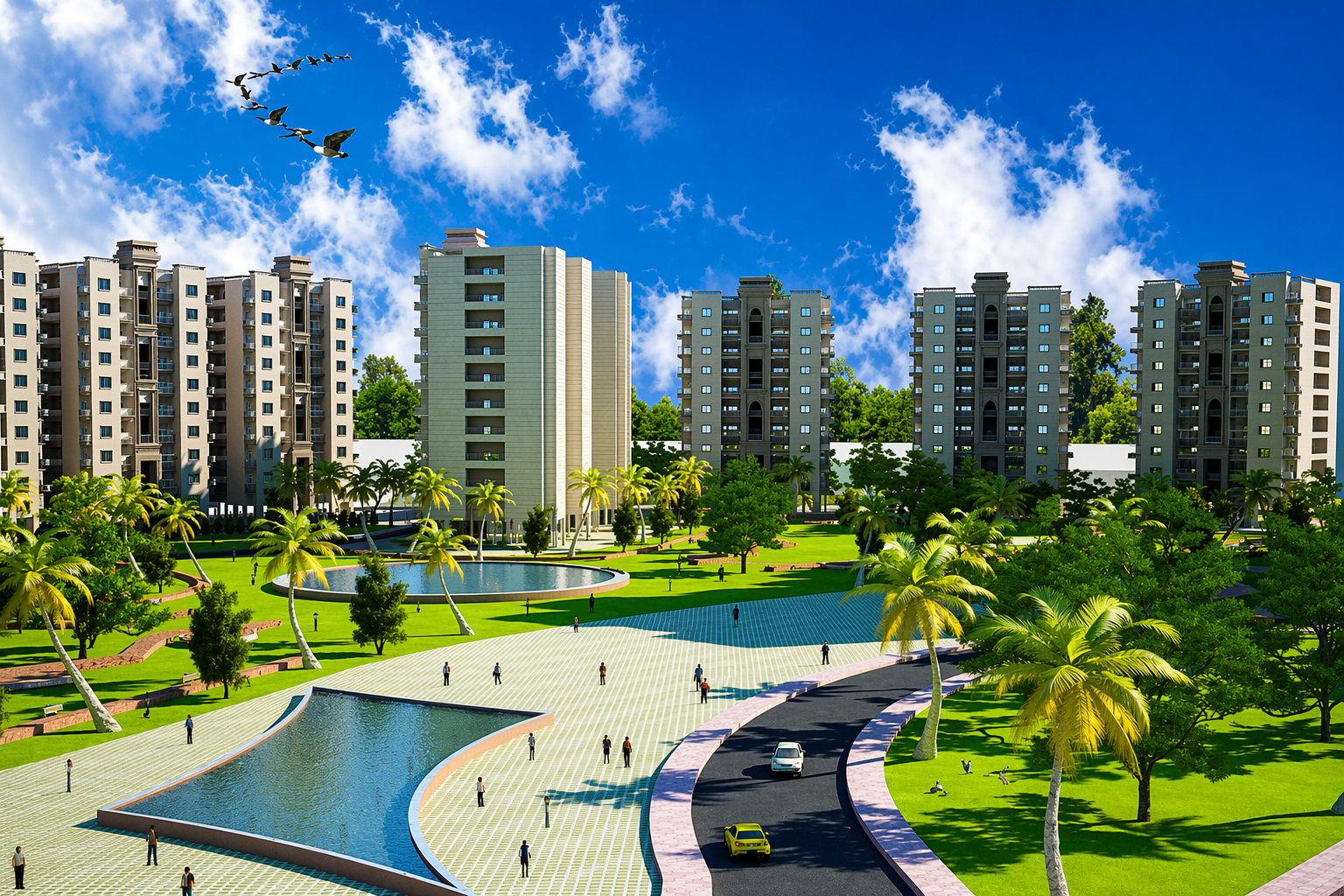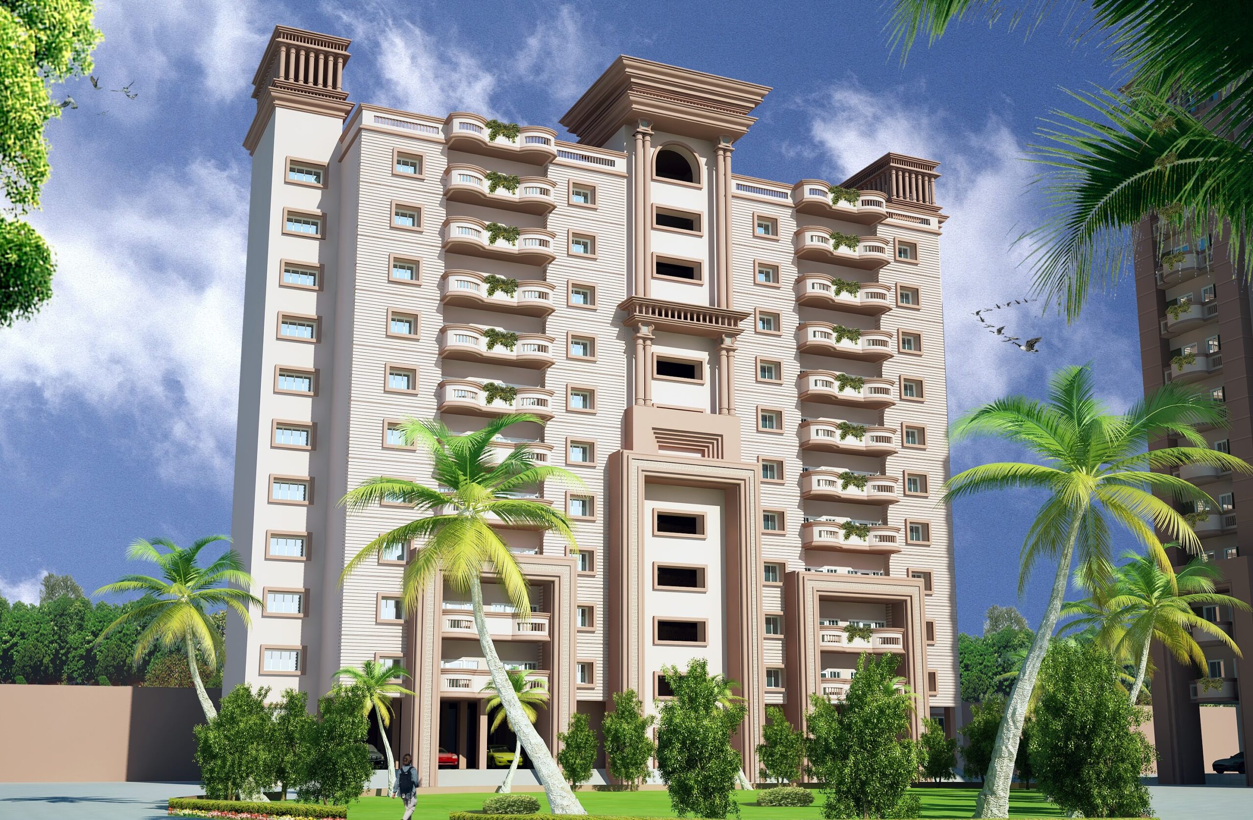 The Ultra Modern Residential Colony at Mayapuri reflects a refined architectural language that blends contemporary living with classical elegance. The high-rise towers are articulated with symmetrical facades, highlighted by vertical projections, column-like elements, and recessed balconies that add depth and rhythm. Soft earthy tones combined with textured surfaces create a warm yet sophisticated visual identity. Generous fenestration ensures ample natural light and ventilation, enhancing indoor comfort. The master planning emphasizes open green courts, water features, and pedestrian-friendly pathways, fostering community interaction. Overall, the design achieves a harmonious balance between built mass and landscape, offering a modern, sustainable, and visually cohesive residential environment.