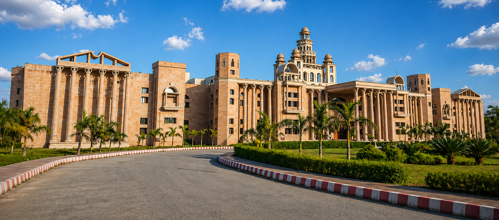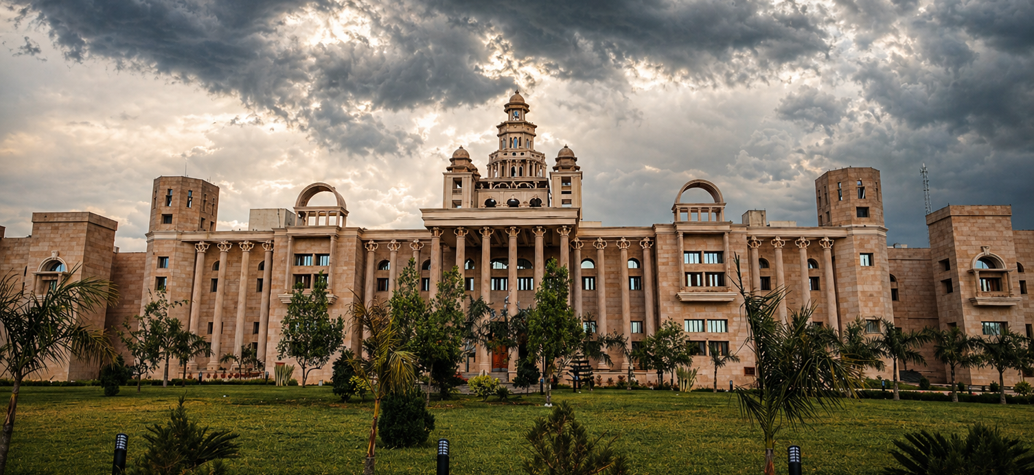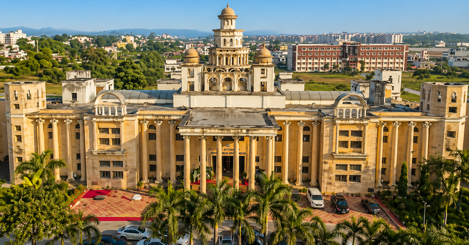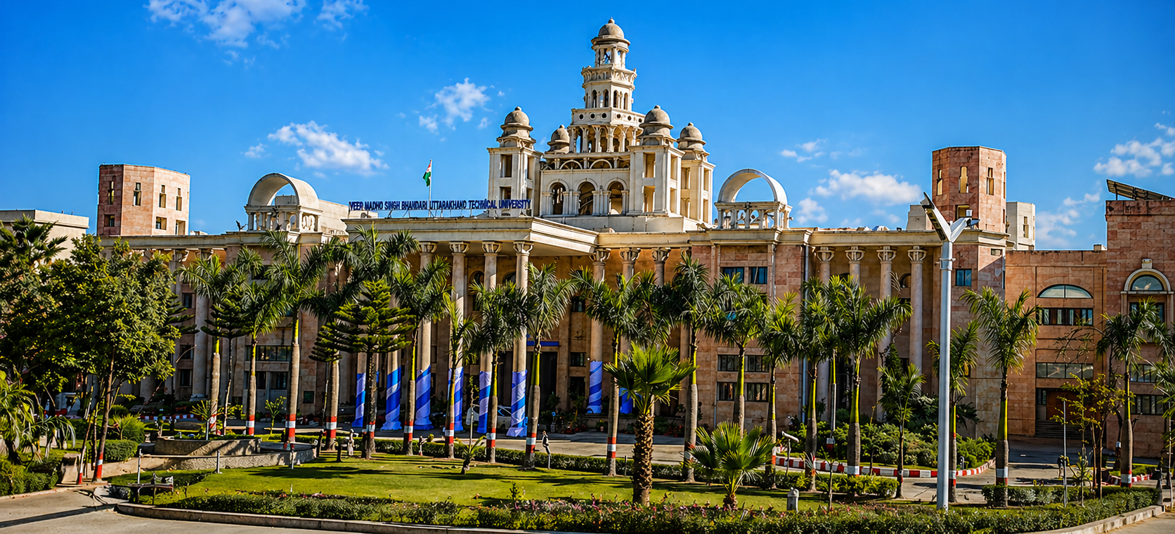 The architecture of Veer Madho Singh Bhandari Uttarakhand Technical University presents a monumental and dignified academic character, shaped through a strong axial composition and impressive symmetry. The building features a grand central tower rising above the main block, flanked by domed elements and long colonnaded façades that lend it a timeless institutional presence. Its sandstone-toned exterior, deep porticos, arched openings and vertically proportioned bays create a refined balance between classical expression and modern functionality. The expansive forecourt, landscaped greens and palm-lined approach further enhance the ceremonial quality of the campus, giving the university a memorable identity rooted in order, prestige and permanence.
