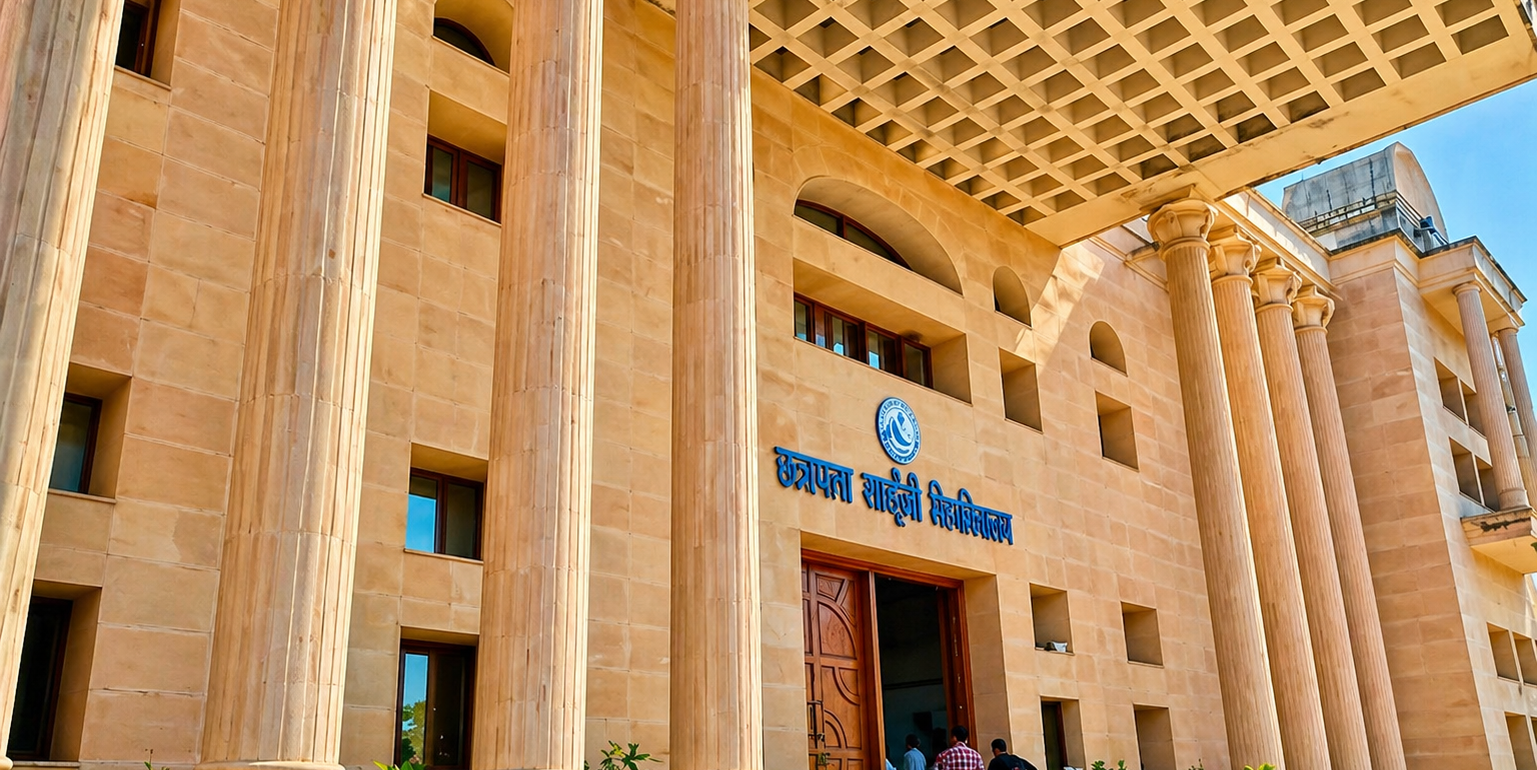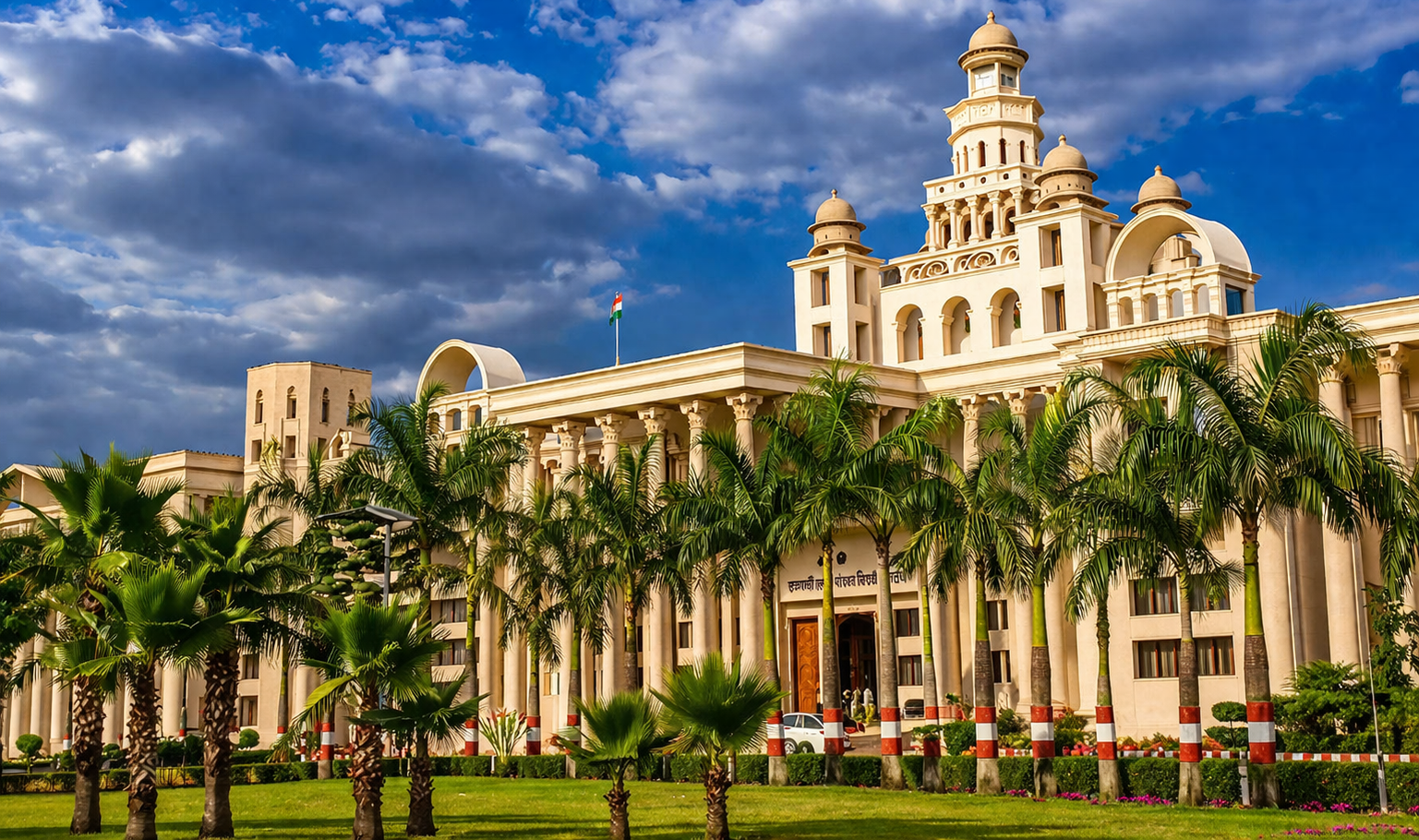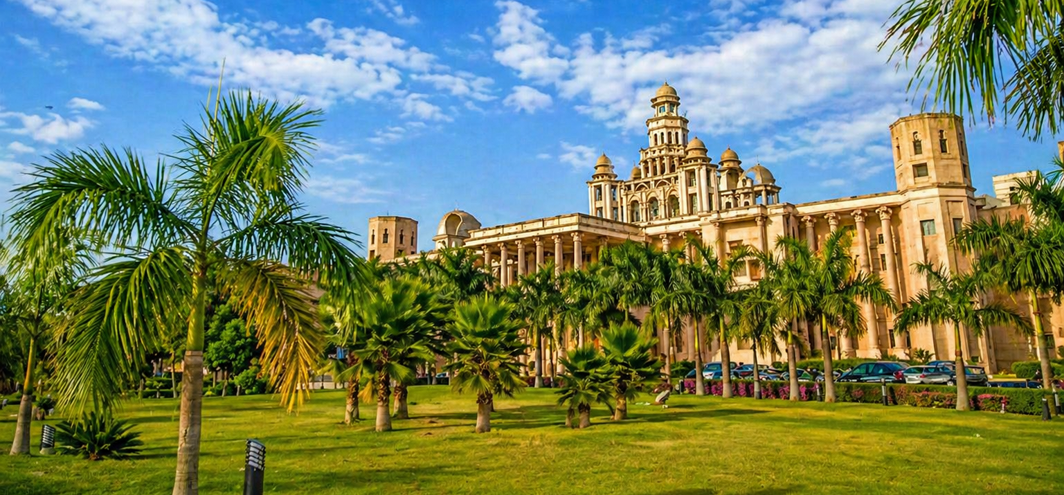The architecture of Veer Madho Singh Bhandari Uttarakhand Technical University presents a monumental and dignified academic character, shaped through a strong axial composition and impressive symmetry. The building features a grand central tower rising above the main block, flanked by domed elements and long colonnaded façades that lend it a timeless institutional presence. Its sandstone-toned exterior, deep porticos, arched openings and vertically proportioned bays create a refined balance between classical expression and modern functionality. The expansive forecourt, landscaped greens and palm-lined approach further enhance the ceremonial quality of the campus, giving the university a memorable identity rooted in order, prestige and permanence.